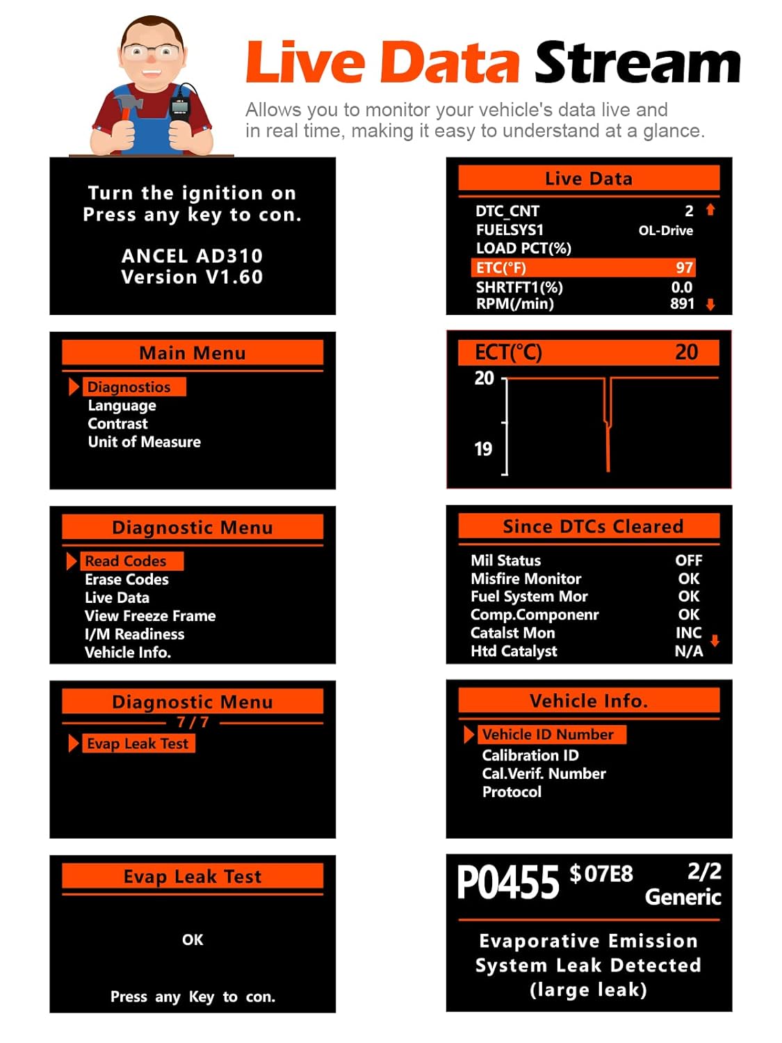 - CEL Doctor: The ANCEL AD310 is one of the best-selling OBD II scanners on the market and is recommended by Scotty Kilmer, a YouTuber and auto mechanic. It can easily determine the cause of the check engine light coming on. After repairing the vehicle’s problems, it can quickly read and clear diagnostic trouble codes, read live data & hard memory data, view freeze frame, I/M monitor readiness and collect vehicle information.