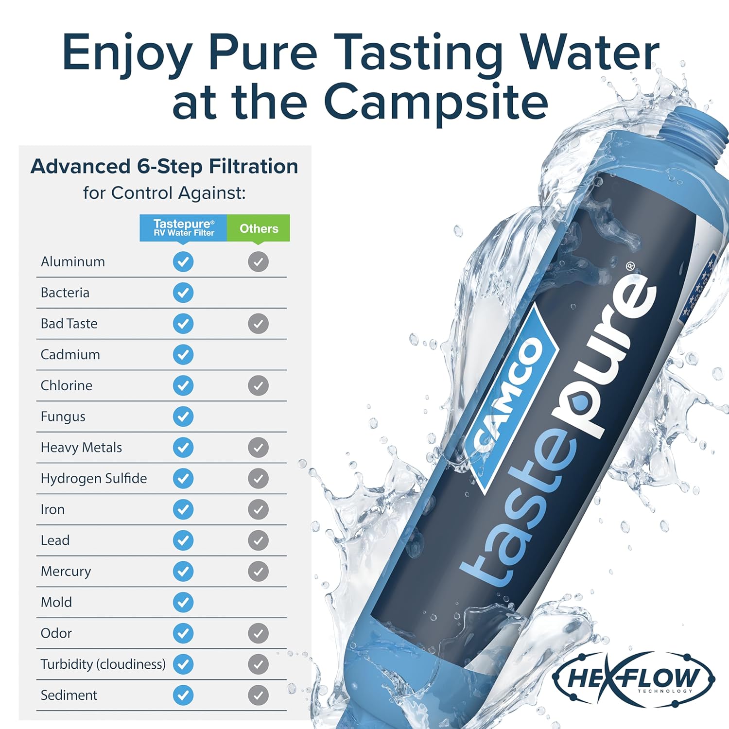 - Advanced 6-Step Filtration Technology: Discover the impressive power of the Tastepure RV water filter’s Hex-Flow Technology and its 6-step filtration process. Each layer seamlessly works together to deliver water that’s exceptionally clean.