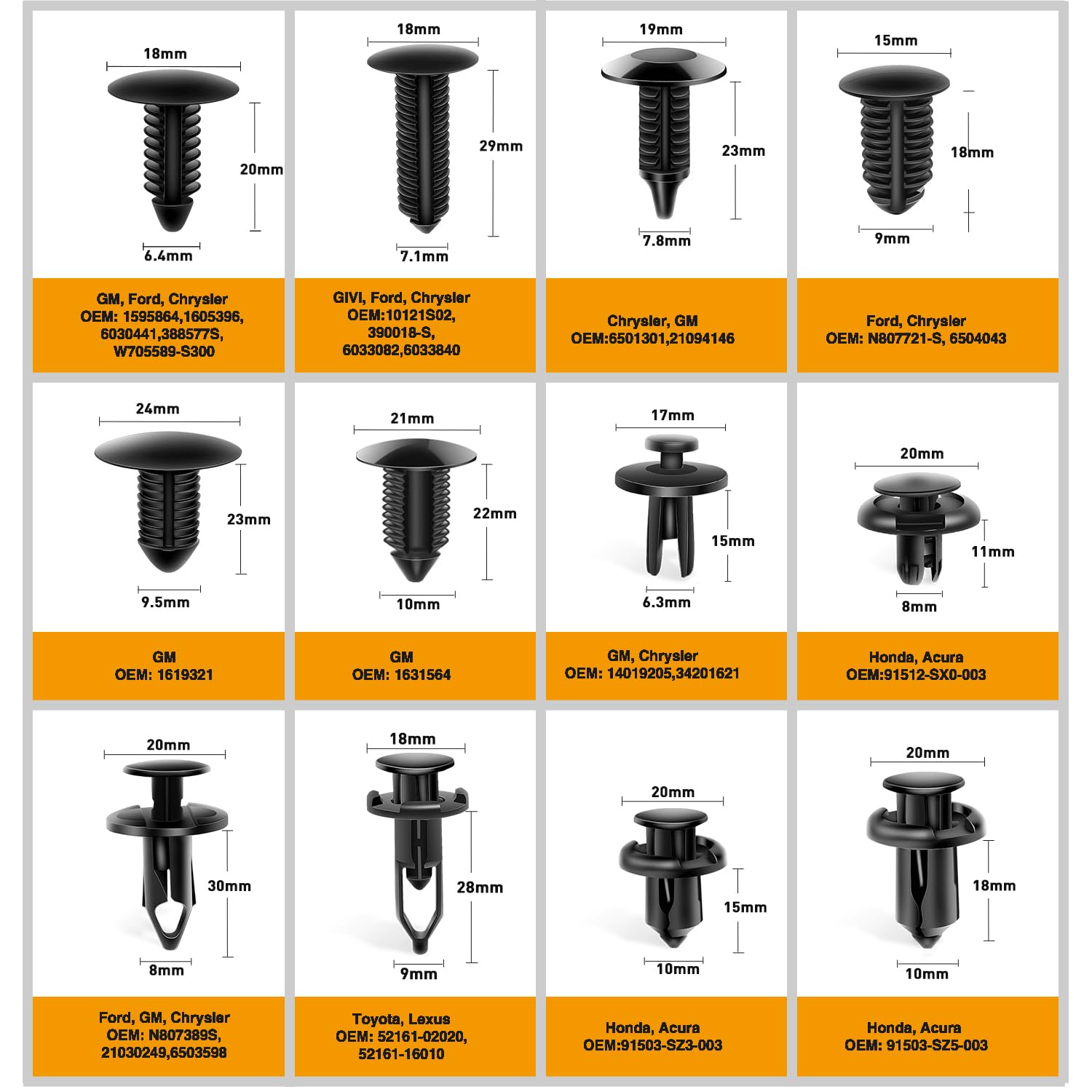 - UNIVERSAL FIT KIT – Great Assortment Push Retainer Kit with 12 popular size, fitting for door trim, radiator shield yoke, fender, bumper and splash shield retainers replacement for Ford, GM, Chrysler, Toyota, Honda and more.