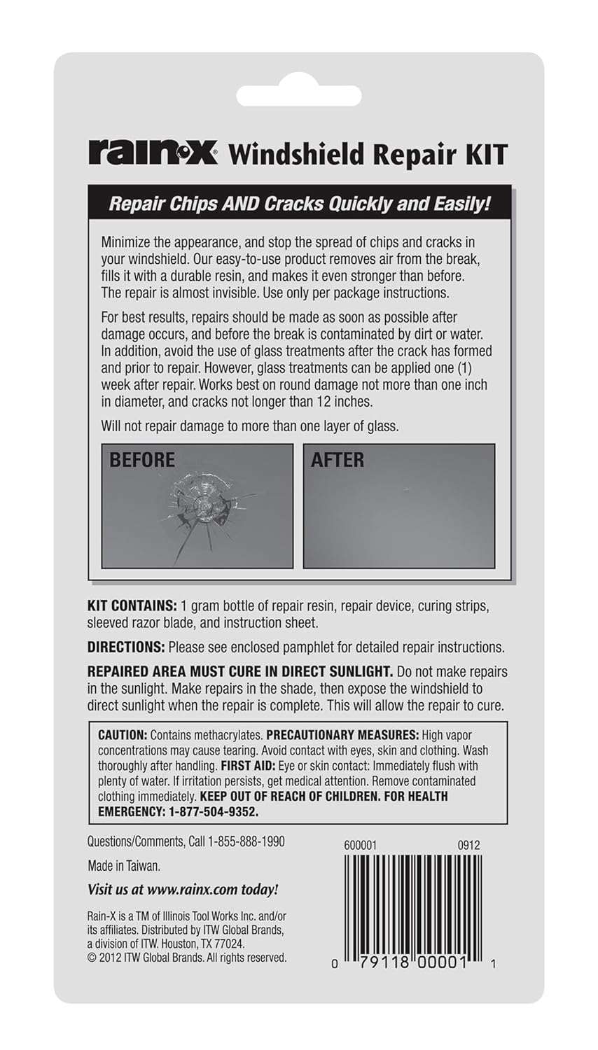 Editor’s Choice — discover the Rain-X 600001 Windshield Repair Kit – Quick and Easy Durable Resin Based Windshield Repair Kit for Chips and Cracks, Good for Round Damage Below 1″ in Diameter and Cracks… by Rain-X, built for performance and designed for life in the United States.