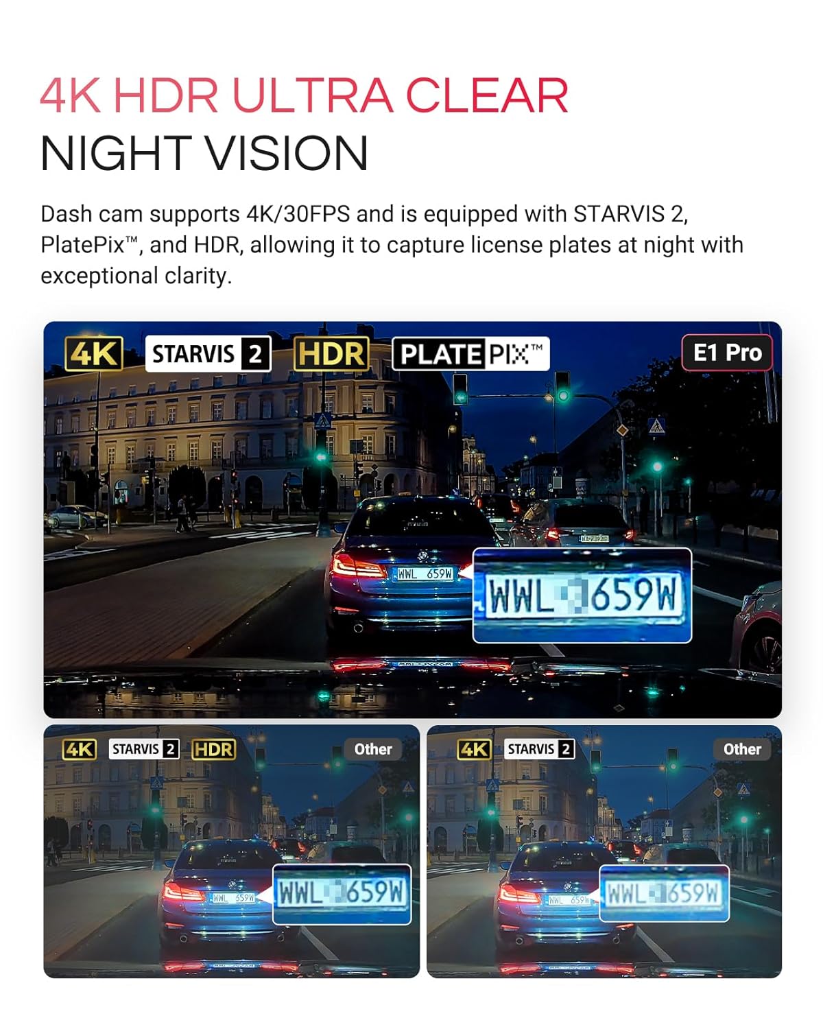 - [PlatePix & STARVIS 2 Night Vision] Vantrue E1 Pro Dash Camera features advanced PlatePix software, delivering scalable 4K HDR that is 50% clearer than standard 4K HDR. With the combination of PlatePix, STARVIS 2 and F1.8 7-glass lens, dash cam reduces motion blur and enhances license plate recognition. Testing indicates that E1 Pro can effectively capture license plates even at night while traveling at speeds of up to 31mph. Perfect for family vehicles, new drivers!