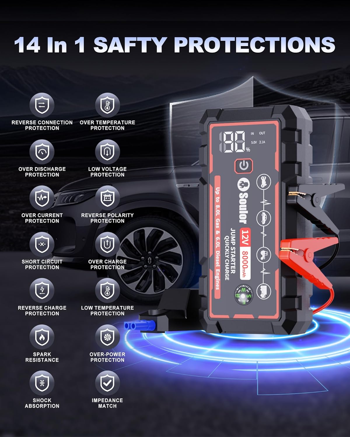 - 14 In 1 Safety Protections: This car battery jump starter portable has 14 integrated protections without worrying about incorrect connections or sparks even if you’re a novice.Perfect for emergencies, professional car work, and high-voltage maintenance, offering peace of mind and added protection.Ensure your trip is safe and smooth