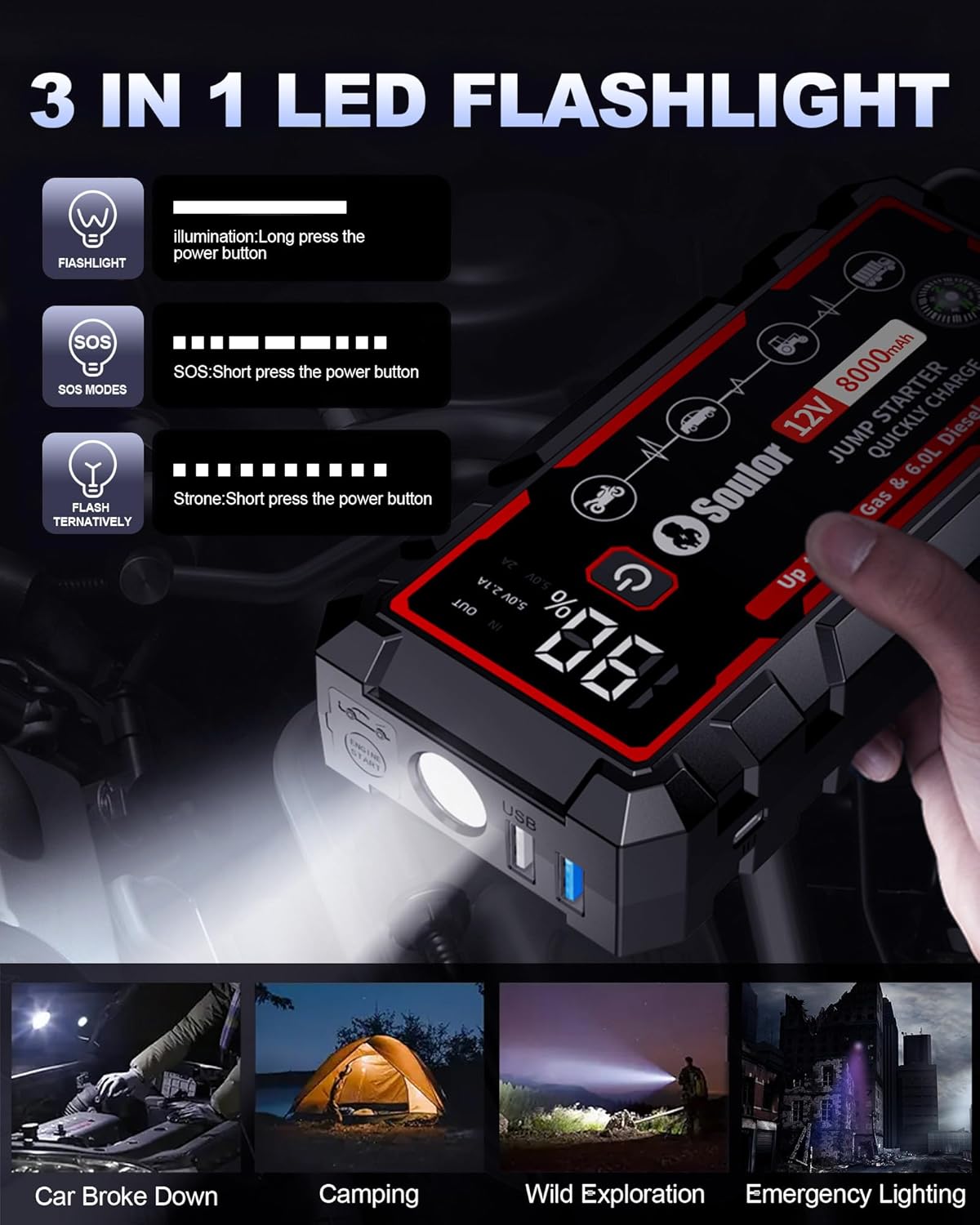 Photos: 5000A Car Battery Jump Starter, 8 in 1 Jumper Box for Car Battery Portable for Up to 8.0L Gas & 6.0L Diesel with 3 Modes Flashlight, Compass, Power Bank and 14 in 1 Jumper… by Soulor