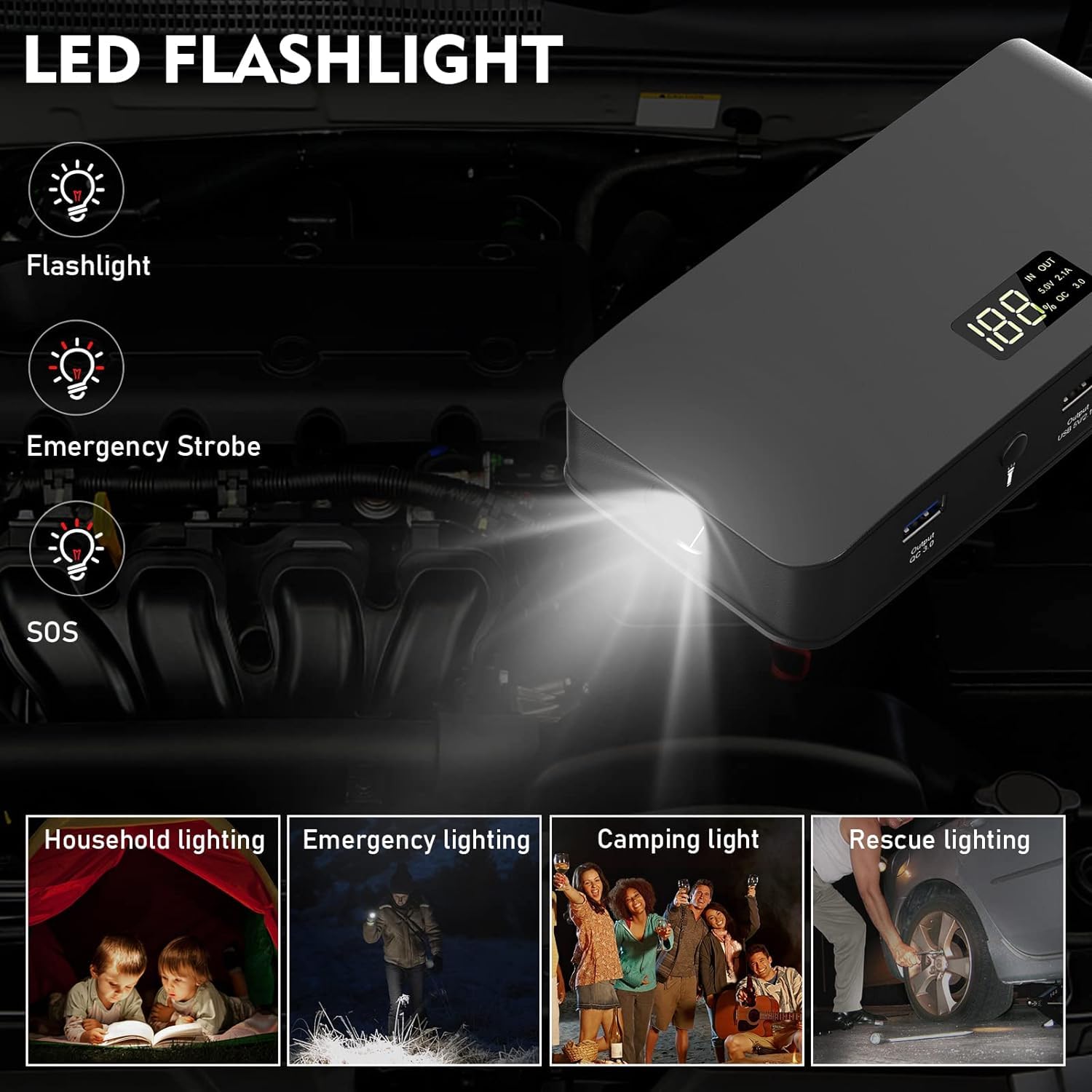 - 🚗【3-IN-1 LED Flashlight】 – The portable battery jumper starters has a built-in LED flashlight with 3 modes (Lighting/Strobe/SOS) for emergency and outdoor adventures.
