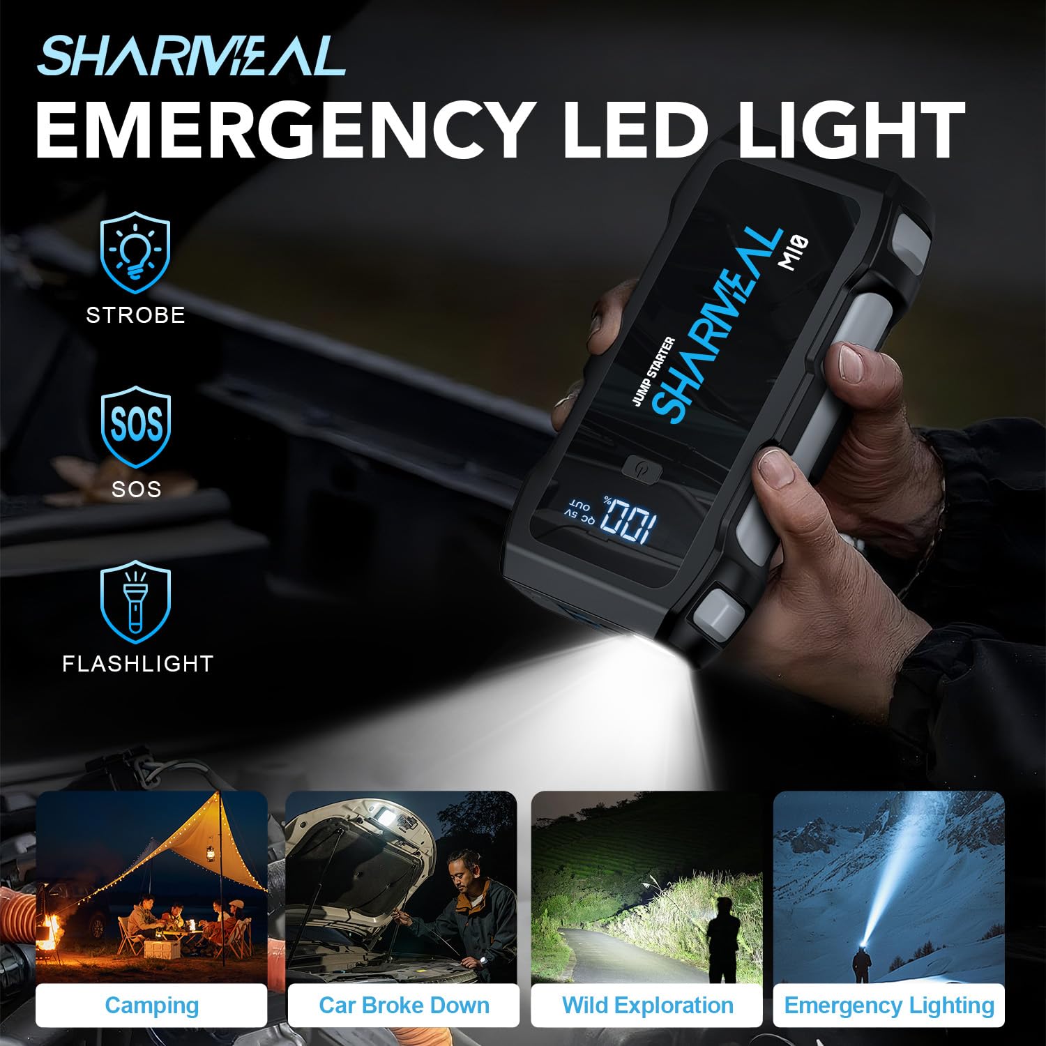 - ใStart Dead BatteriesใThe Sharmeal car battery jump starter power pack with 5000A peak, safely start the 12V vehicles in seconds with this booster(up to 10.0L gasoline/9.0L diesel engines). It is suitable for cars, trucks, motorcycles, boats, rvs, tractors, snowmobiles, etc. Operation Steps: 1. Insent the jumper cable into the booster, the traffic lights of the smart clip will flash alternately. 2. Connect the clamps to your car battery,the green light indicates a successful connection 3. Start your car engine 4. Remove the jumper cable.