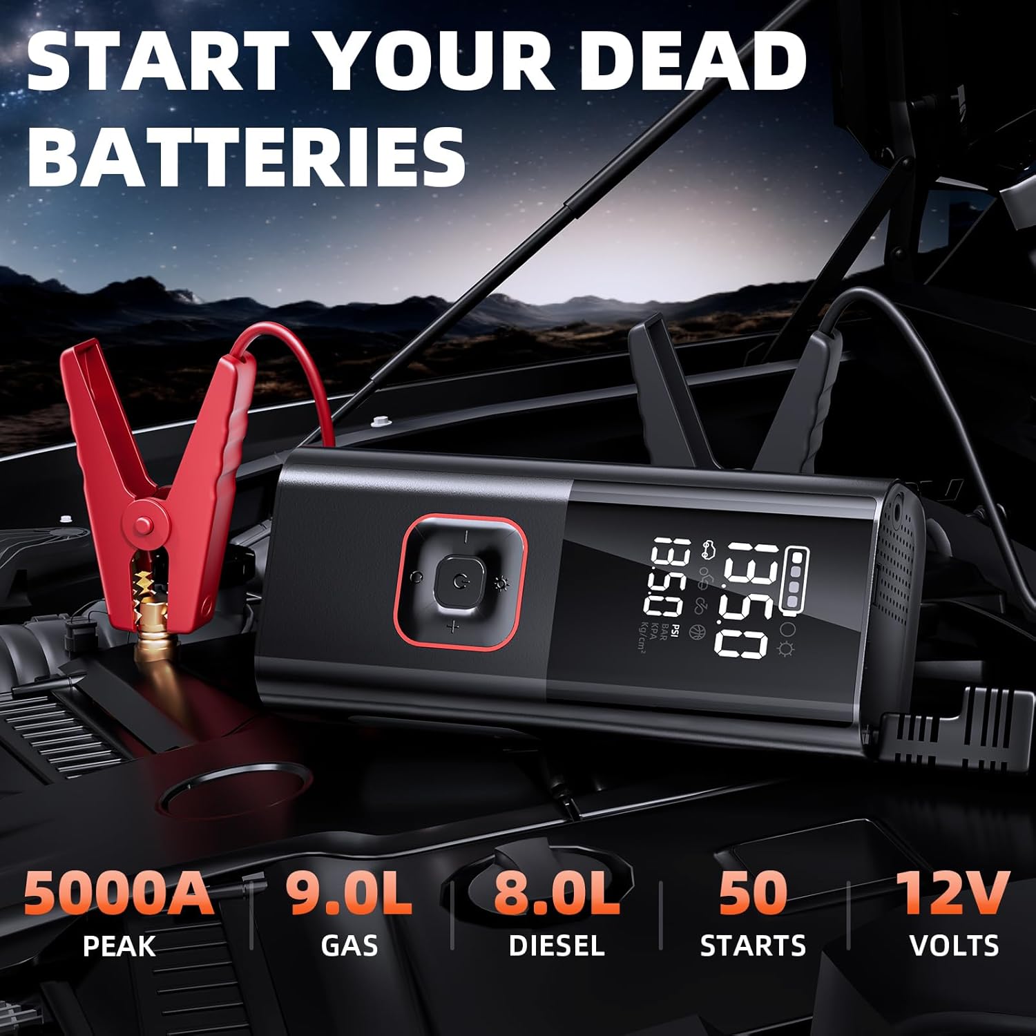 About Jump Starter with Air Compressor, 5000A Battery Jumper Starter Portable (9L Gas/8L Diesel) with 160PSI Auto-Shutoff Tire Inflator, 12V Jump Box Car Battery Jump Starter with…