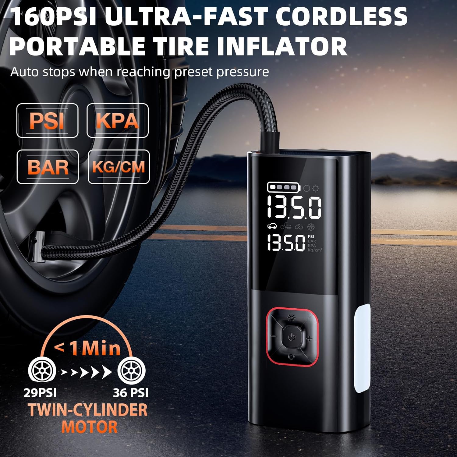 - Jump Starter with Air Compressor: A built-in air compressor automatically stops inflation at a preset PSI (up to 160 PSI) to prevent overinflation. With real-time pressure sensing and up to 25 minutes of continuous run time, it ensures optimal tire pressure is maintained every time, ensuring a safer driving experience.