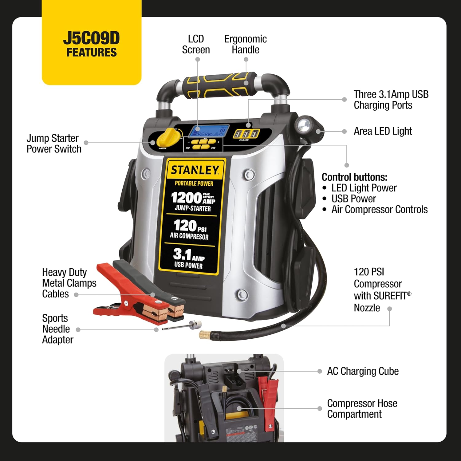 STANLEY J5C09D 1200 Peak Amp Automotive Jump Starter, Portable Power – 2.1A/10W USB Port, 120 PSI Air Compressor by STANLEY