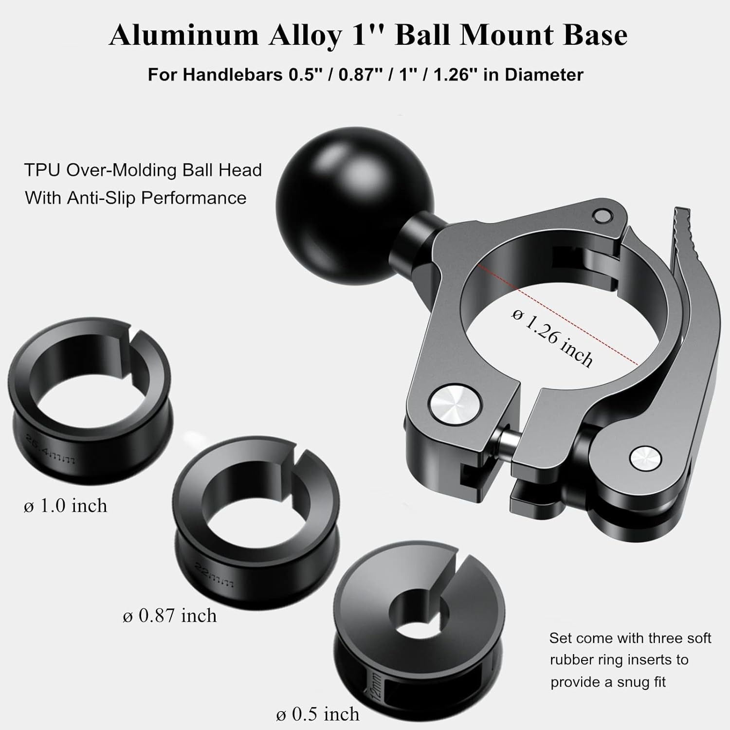 - This 1” ball mount base accommodates handlebars 0.5 inch(12mm) / 0.87 inch(22mm) / 1 inch(25.4mm) / 1.125 inch(28.6mm) / 1.26 inch(32mm) in diameter. Tool-less design for easy installation or removal