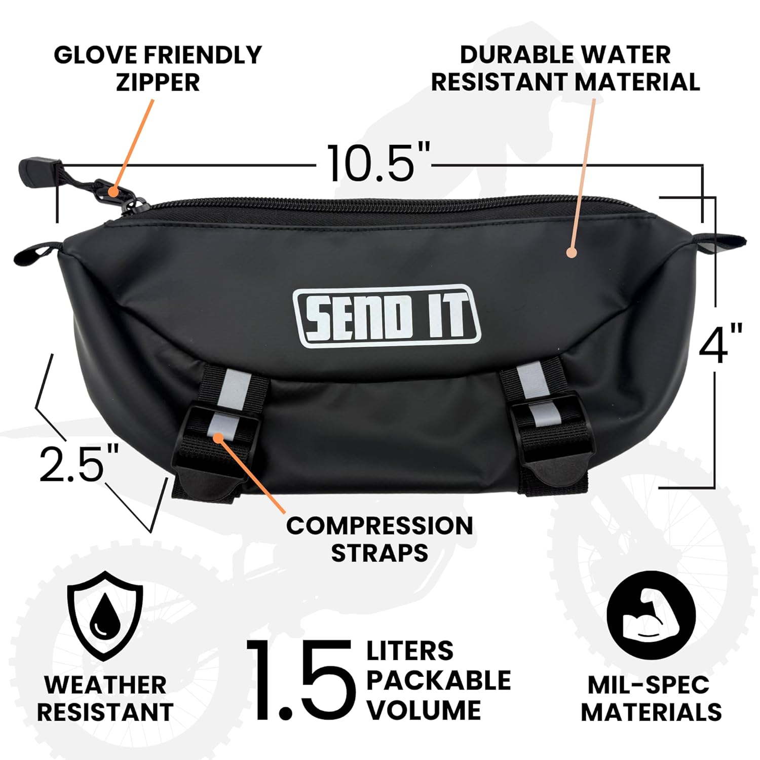 - Adventure-Ready Design: Water-resistant zippers and weather-sealed seams make this handle bar bag motorcycle-grade for all-weather protection—ideal for motocross, enduro, ADV, and snow riders looking for a rugged dirtbike bag or motorcycle handlebar bag.