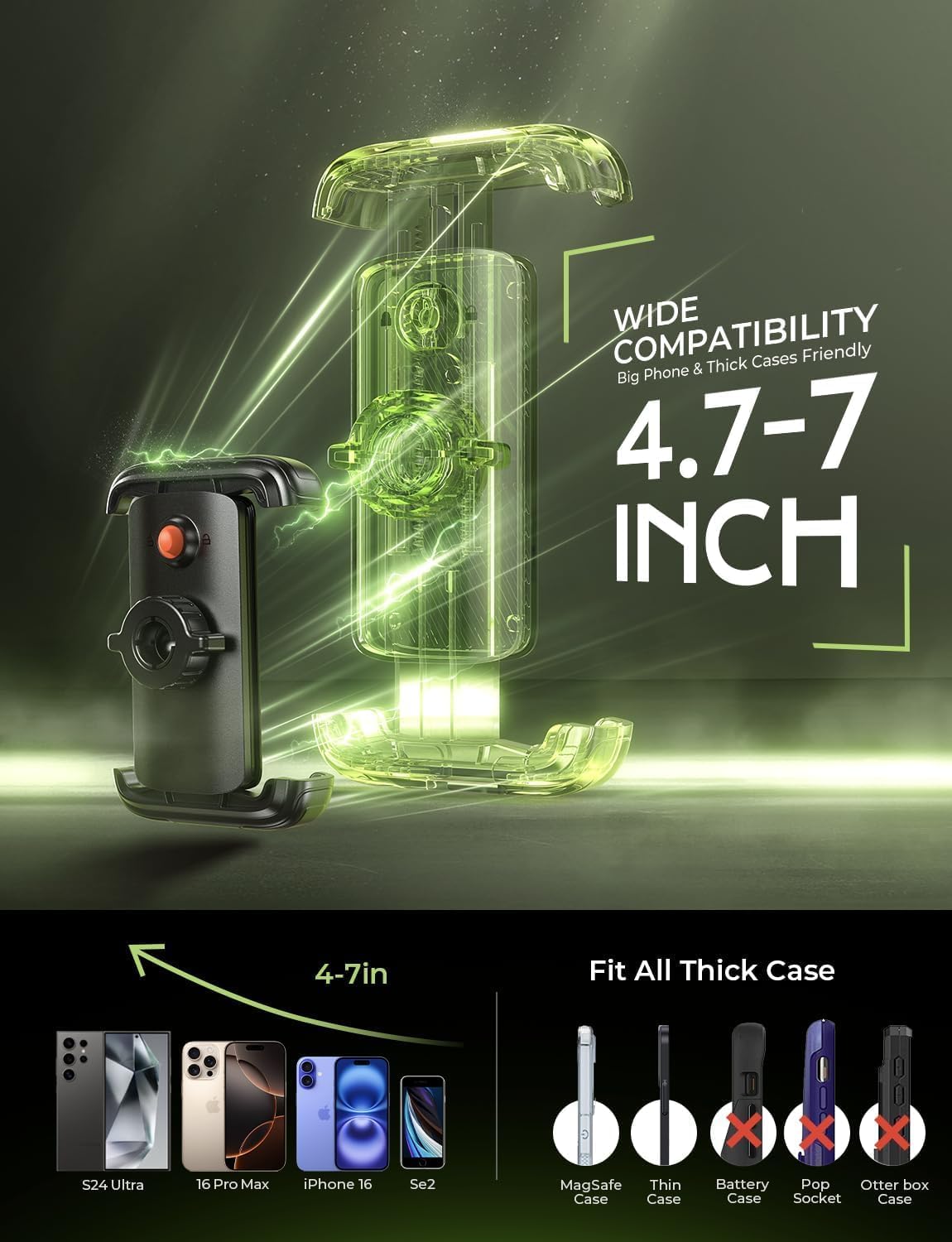 - [Wide Compatibility for Phones] Universal phone holder for bike in the market is adjustable for 4.7-6.8″, thickness up to 15mm (including phone case), but LISEN bike phone holder fits cell phones 4.5-7″, thickness up to 20mm, fits nearly all phones, Such as iPhone 16 Pro Max, Samsung Galaxy S24 Ultra.