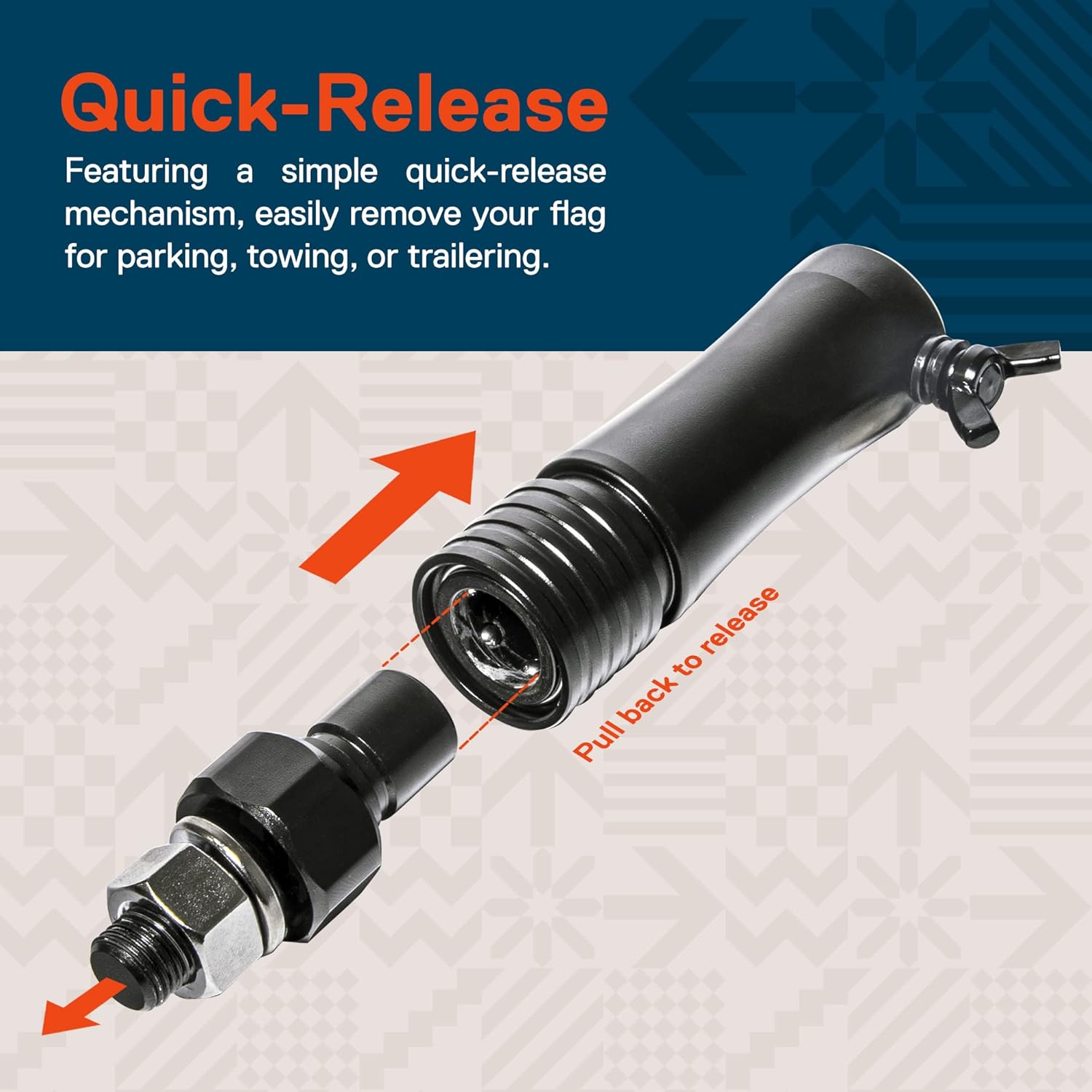 - QUICK-RELEASE – Smacking your whip into the top of your garage or toy hauler is never fun. Our whip bases feature a simple quick-release mechanism so you can easily remove the whip for parking, towing, or trailering.
