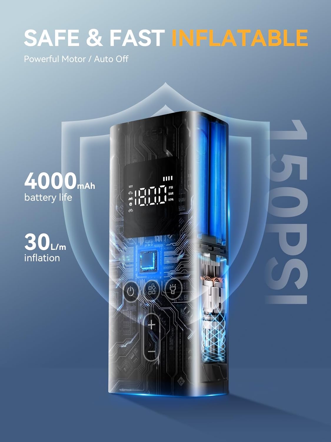 - Fast Inflation for On-the-Go Drivers:Say goodbye to waiting. Whether you’re a busy commuter or a weekend adventurer, the AIRSURE portable tire inflator for car delivers fast inflation up to 150 PSI, 3X faster than traditional inflators, saving time when it matters most. It’s the must-have rechargeable tire inflator for flat-tire emergencies, daily checks, or spontaneous road trips