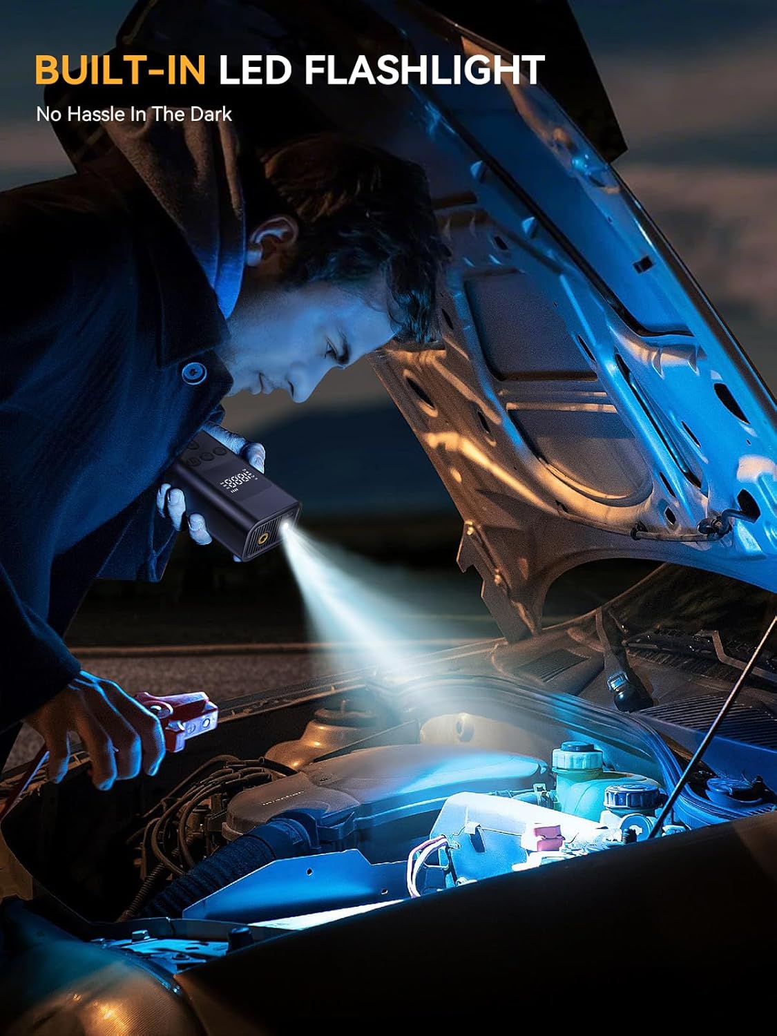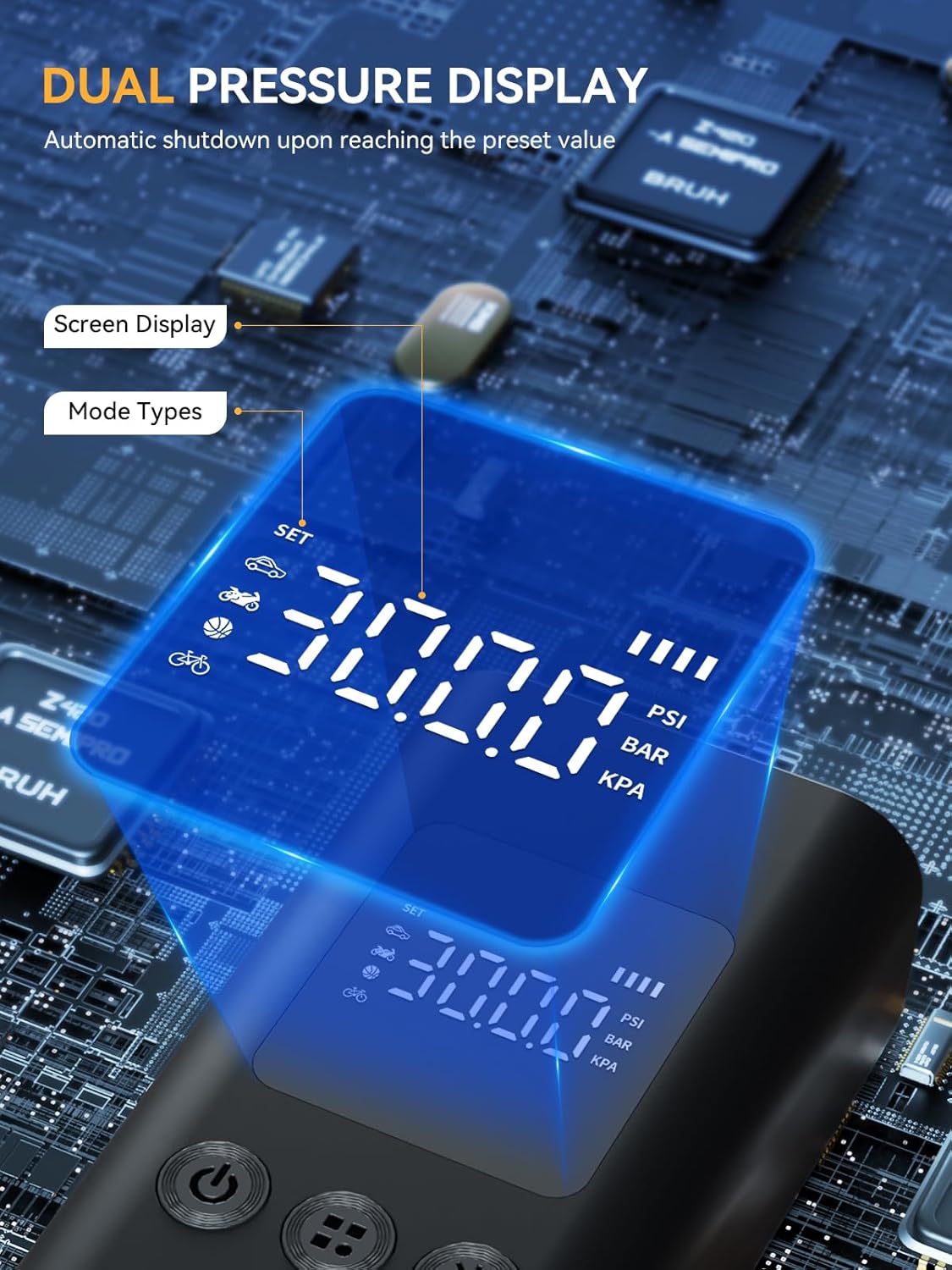 - Auto Shut-Off & Digital Gauge:The portable air compressor car tire comes with a built-in pressure gauge and LCD screen that allows you to accurately monitor real-time tire pressure, and the auto shut-off prevents overfilling. The car tire air pump LED light lets you use it in dark garages or roadside breakdowns. AIRSURE car tire inflator ensuring optimal tire inflation for enhanced safety and performance — making it perfect for new drivers, aging parents, and anyone who just wants convenience