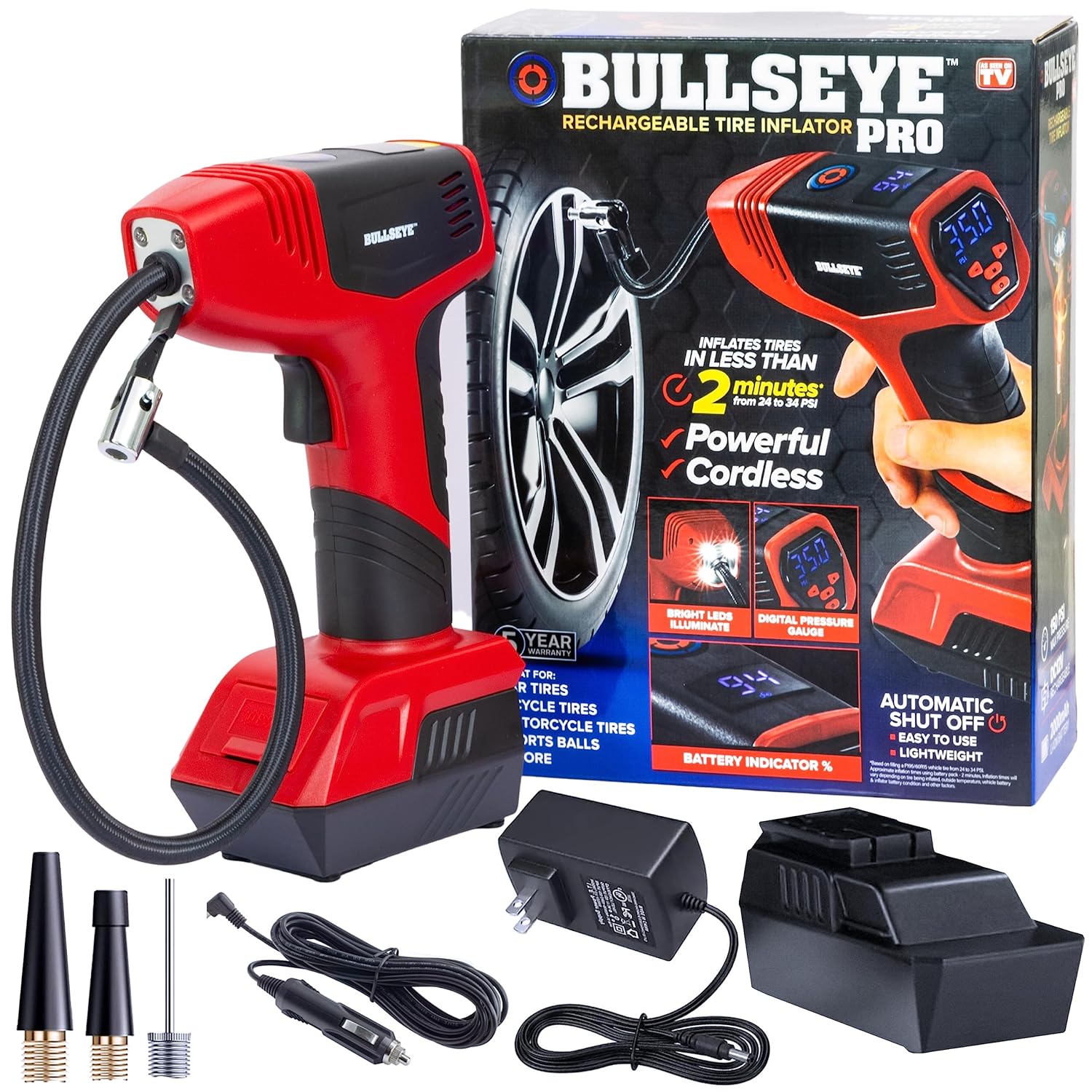 Editor’s Choice — discover the BULLSEYE PRO Tire Inflator with Pressure Gauge, Compact and Portable, Automatic Shut Off, 150 PSI Max, USB Home Rechargeable and Cord for Vehicular Use As Seen On TV (9475) by EMSON, built for performance and designed for life in the United States.