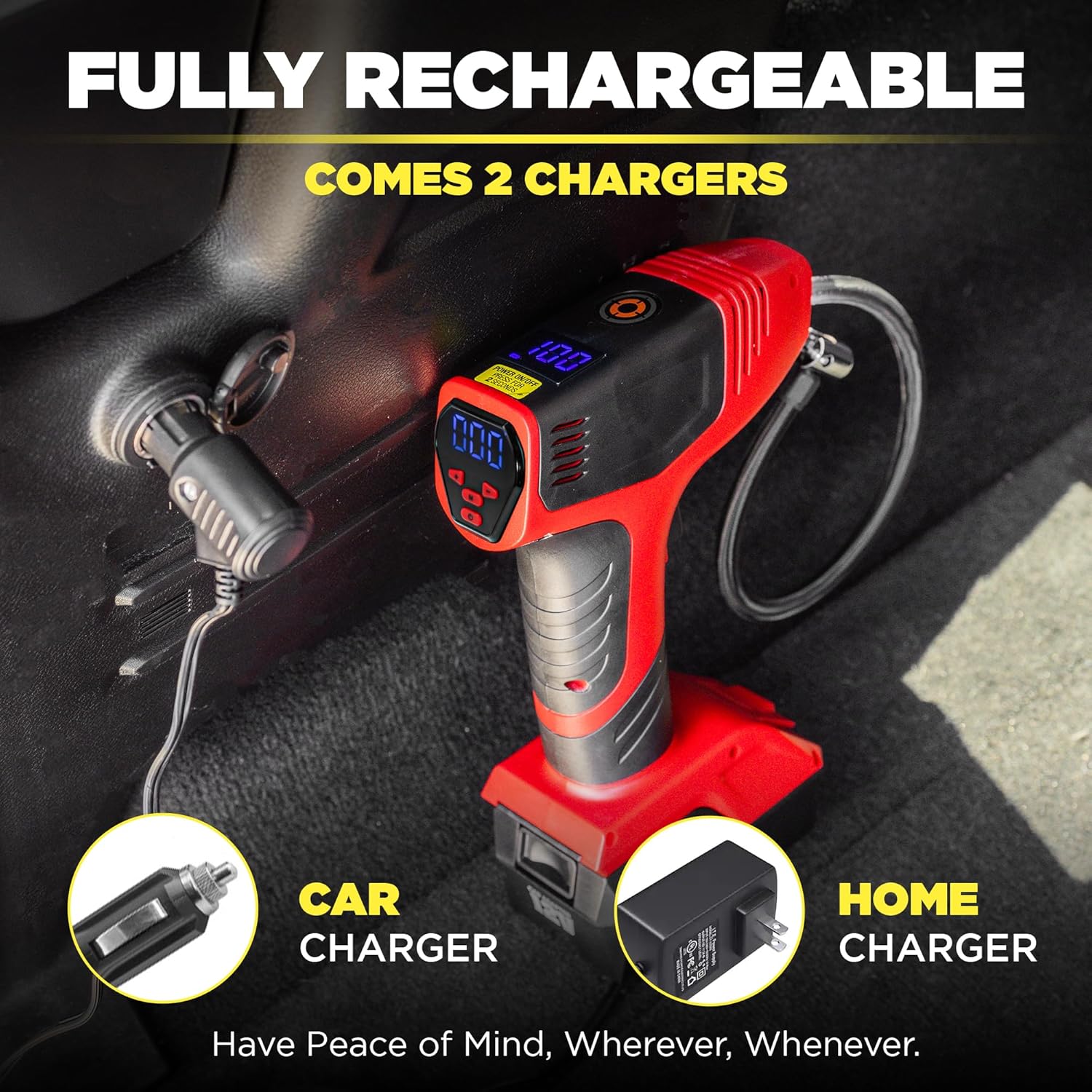 - NEVER GET STRANDED AGAIN – DUAL POWER SYSTEM – Includes 9.8ft DC cord for car use AND 3.3ft USB-C home charging cable. This electric battery powered air pump provides multiple tire inflations per charge – your portable pit crew is always ready.
