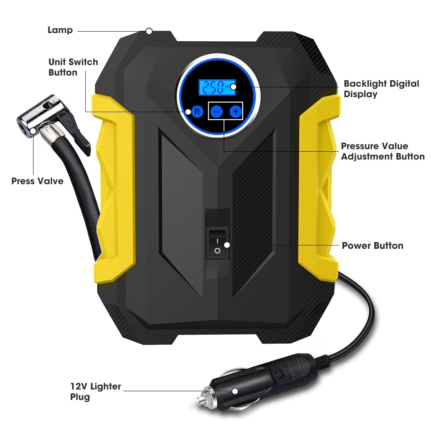 Specification: Digital Air Compressor for Car Auto Pump Portable Tire Inflator with LED Light DC 12V by carsun
