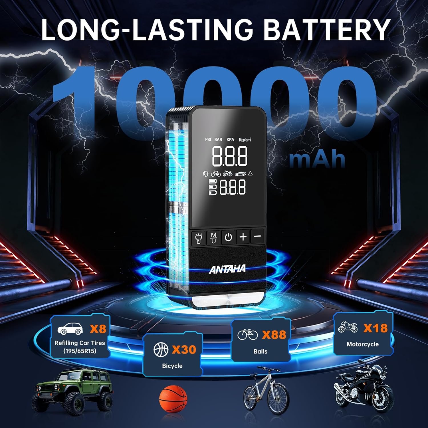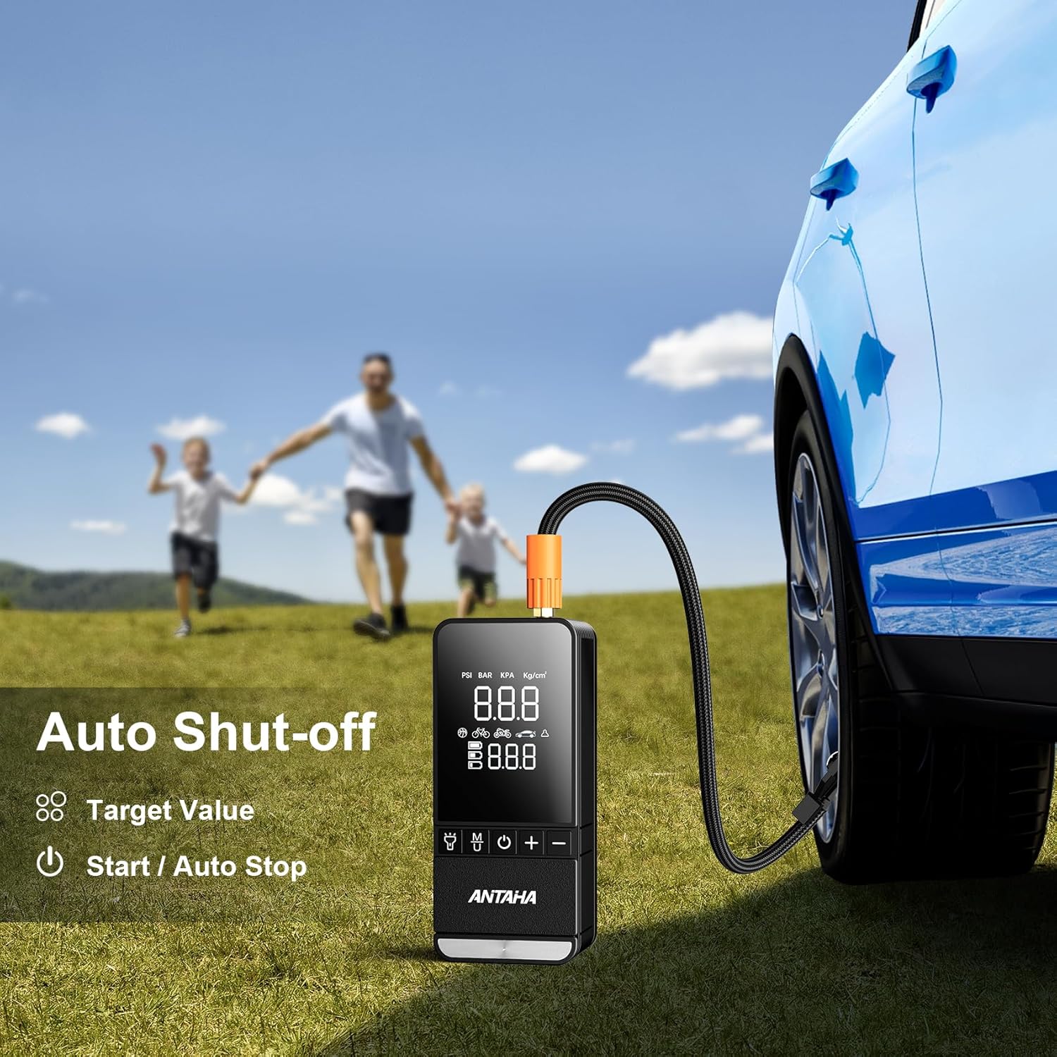 - 3X FASTER INFLATION: ANTAHA portable air pump features a powerful motor and a high-performance chip, providing 150PSI and inflating a tire from 30 to 36 PSI in under 1 minute—3X faster than others