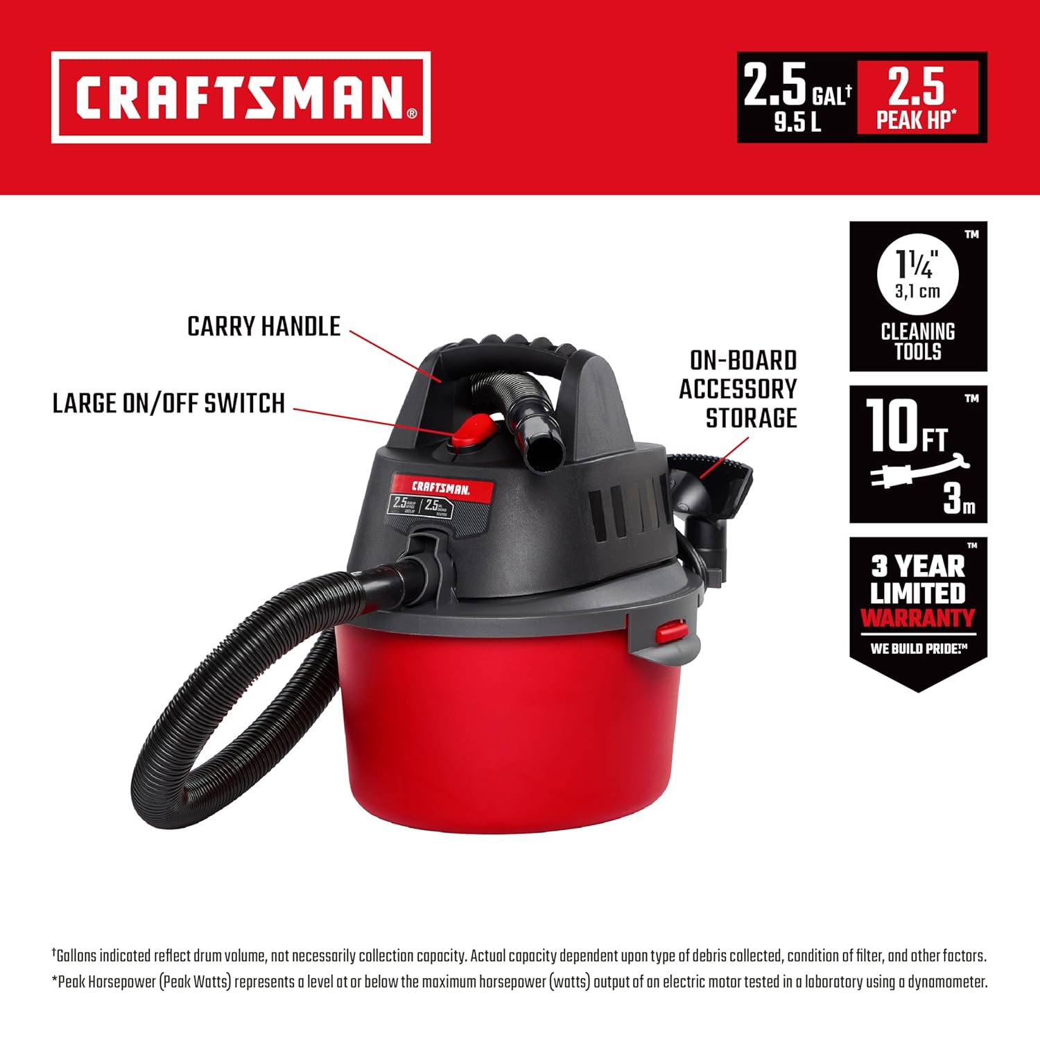 Customer Favorite — discover the CRAFTSMAN CMXEVBE17250 2.5 Gallon 2.5 Peak HP Wet/Dry Shop Vac, Portable Shop Vacuum Wet and Dry with Filter Bag, Hose and Attachments for Cleaning in the Home by CRAFTSMAN, built for performance and designed for life in the United States.