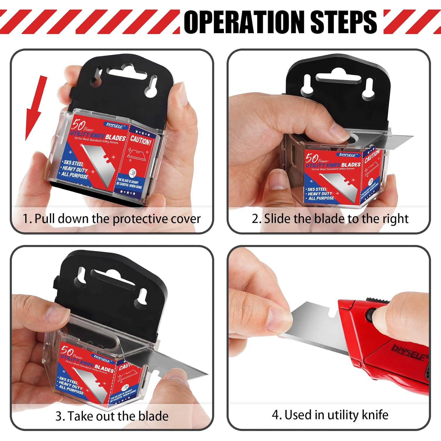 Specification: DIYSELF 50 Pack Utility Knife Blades, SK5 Steel Box Cutter Blades with Dispenser, Standard Blades for Box Cutter Utility Knife Replacement, Sharper Utility Blade, Refills by DIYSELF