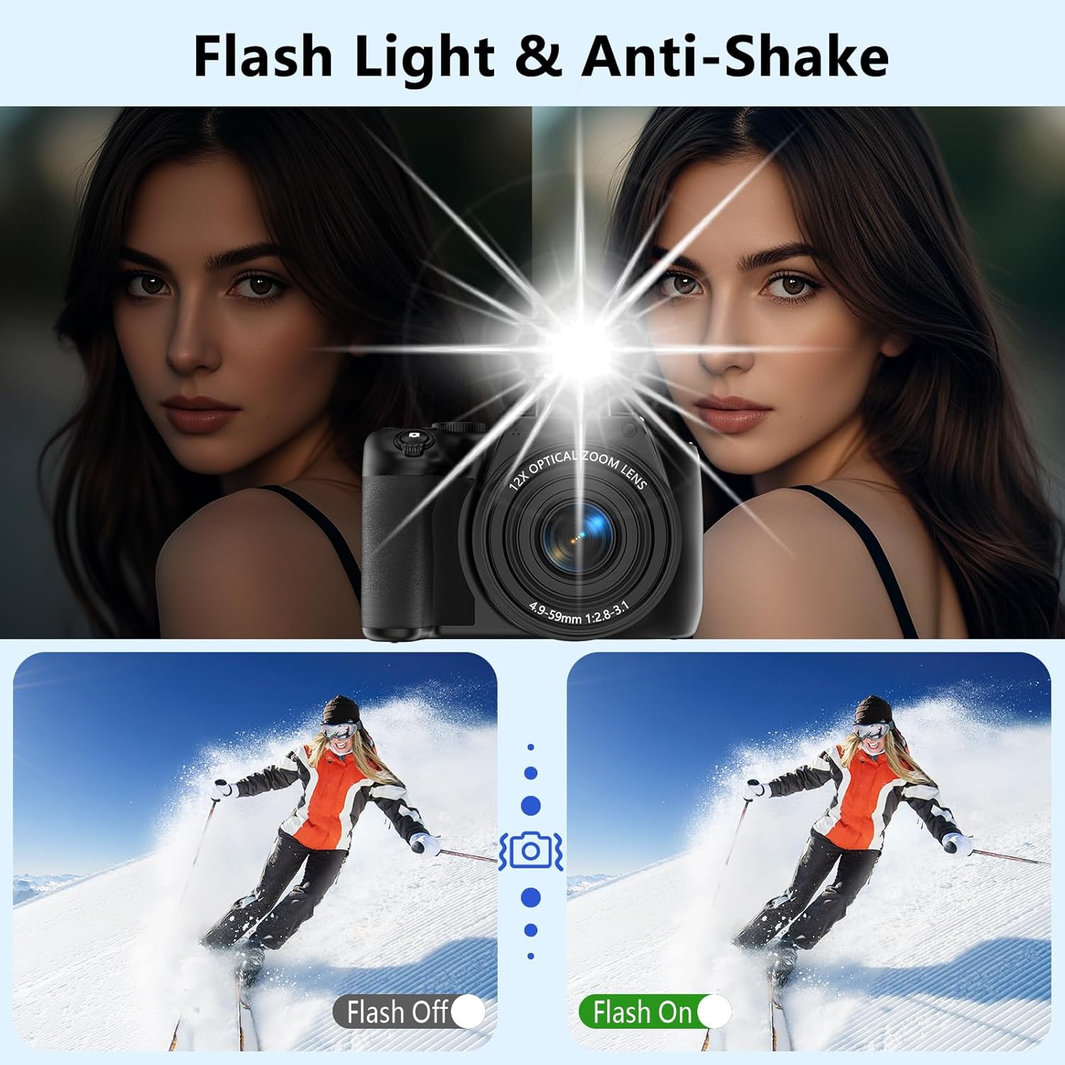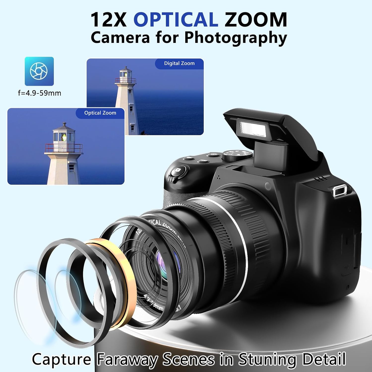 - 𝟏𝟐𝐗 𝐎𝐩𝐭𝐢𝐜𝐚𝐥 𝐙𝐨𝐨𝐦 & 𝐁𝐮𝐢𝐥𝐭-𝐢𝐧 𝐅𝐥𝐚𝐬𝐡: 72MP 12x Optical Zoom Digital Camera Captures Distant Scenery Details Without Losing Quality. The Digital Camera Built-in Flash Ensure Clear Low-Light Shots. With Fast Autofocus and Built-in Anti-shake, Every Shot Remains Sharp and Clear. This Professional Digital Camera is ideal for Beginner Photographers —ideal for Travel, Portraits, and Landscape Shots. Documenting Everyday Moments or Travel Experiences