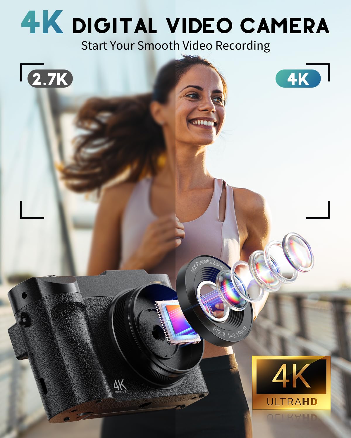 - 【4K UHD & 50MP High-Def Shooting with 180° Flip Screen】Capture stunning videos and stills in ultra HD with this digital camera’s 2.8″ flip screen for framing. Whether documenting family trips, everyday moments, or creating video content, it delivers clear images and smooth video.Ideal mini camera & vlog camera companion.