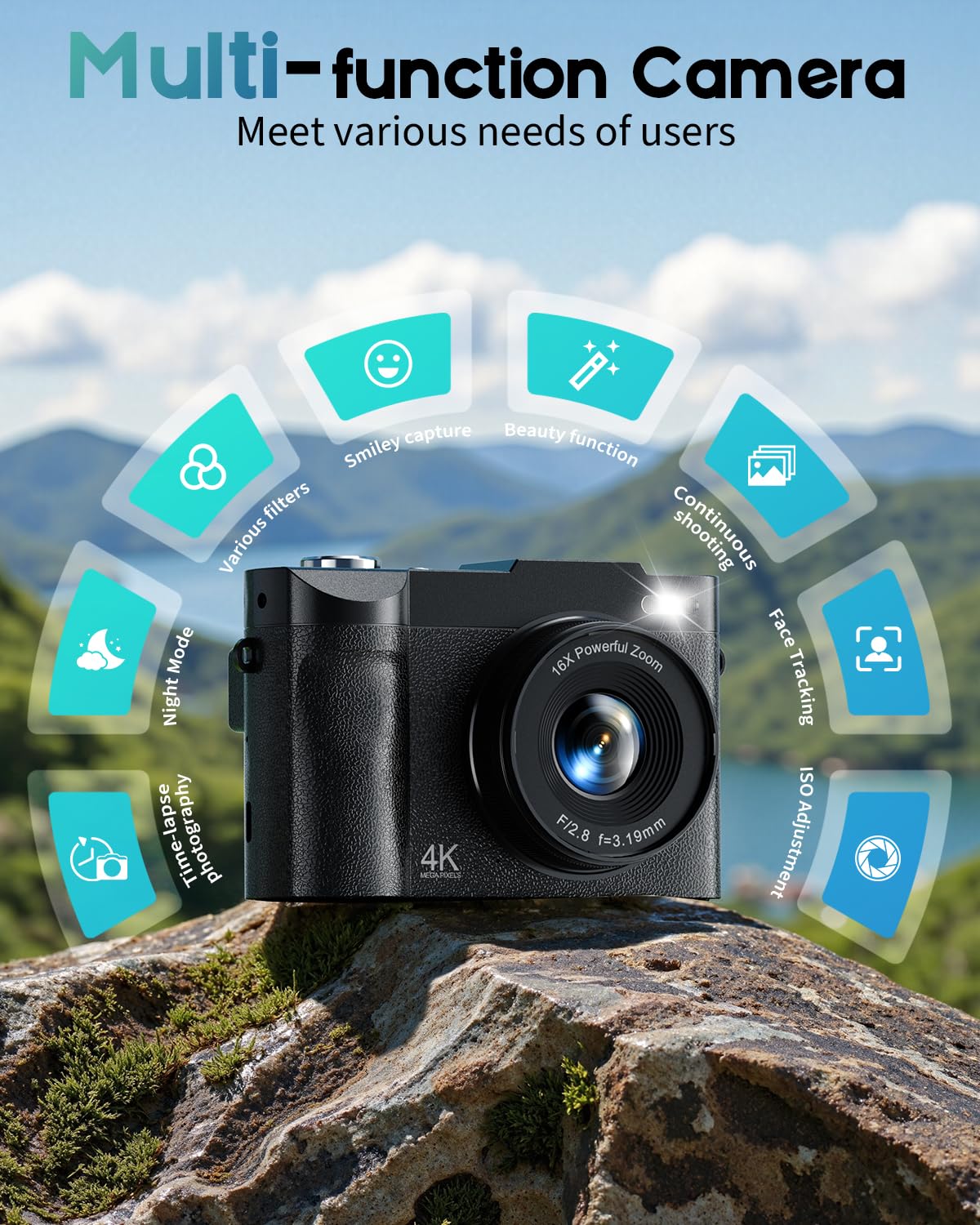 - 【16X Digital Zoom & Precise Autofocus】Get closer with 16X digital zoom and sharp autofocus on this point and shoot digital cameras camcorder. Even if you shoot from a distance, you can still take clear and beautiful photos. Whether shooting landscapes or portraits, this cameras for photography delivers crisp clarity every time.