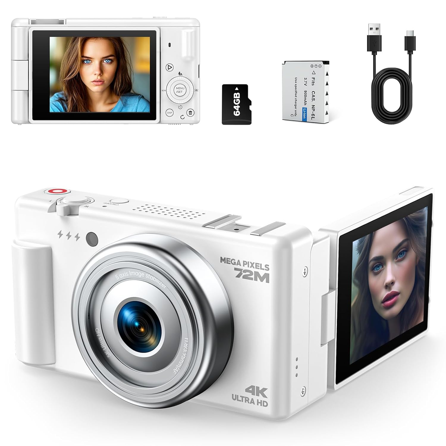 This 4K digital camera is perfect for beginners and teen vloggers! The 72MP resolution and flip screen make it super easy to capture great photos and videos, and the included 64GB SD card and battery are a huge plus. Lightweight, easy to use, and excellent value!