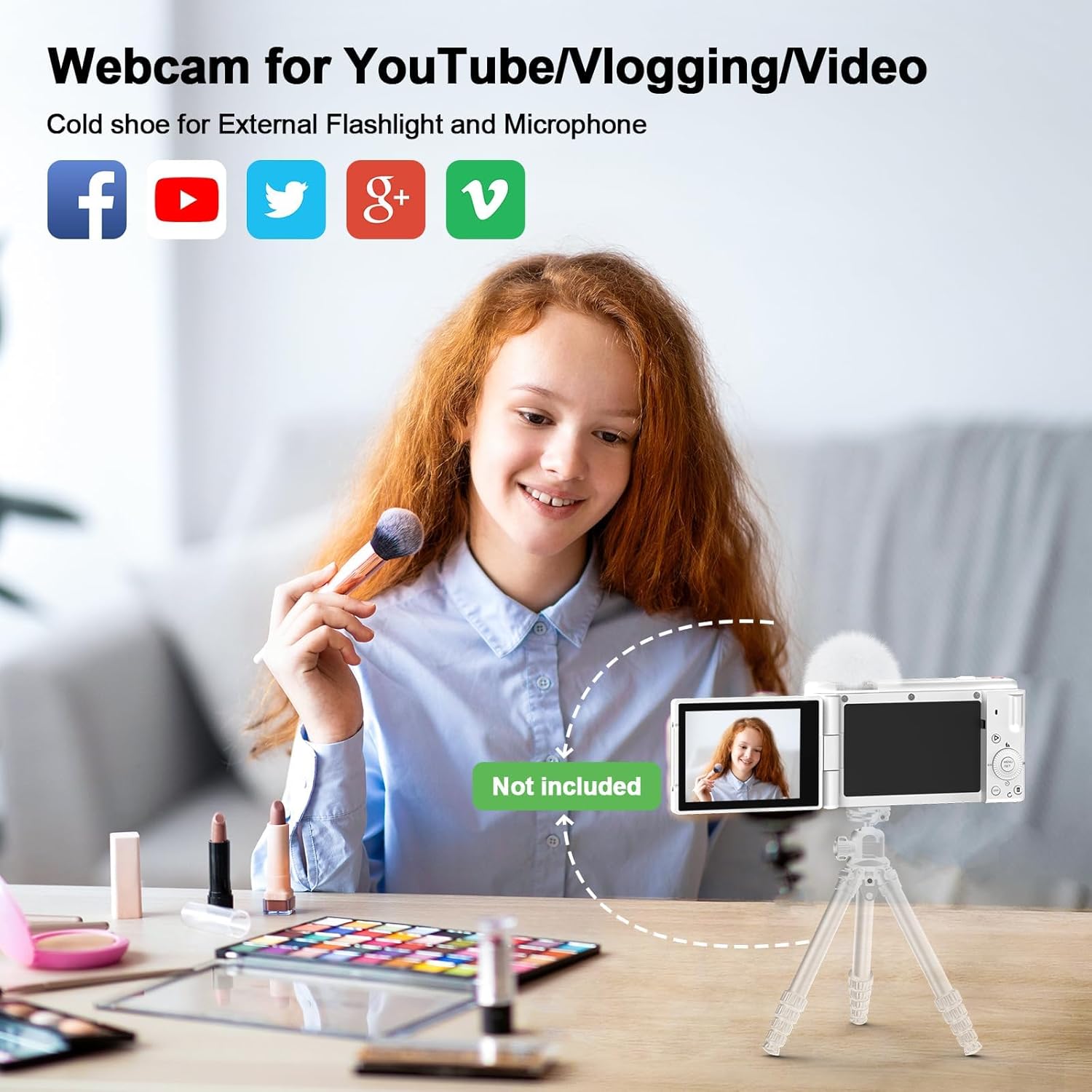 - Digital Camera with Flip Screen: The vlogging camera has a 2.8″ LCD screen and can rotate 270 degrees, allowing you to see what’s being recorded or view it while taking a vlog from any angle. The compact digital camera 4K can also be connected to a tripod (Additional purchase required) for countdown shooting so that you can take pictures in the complete scene