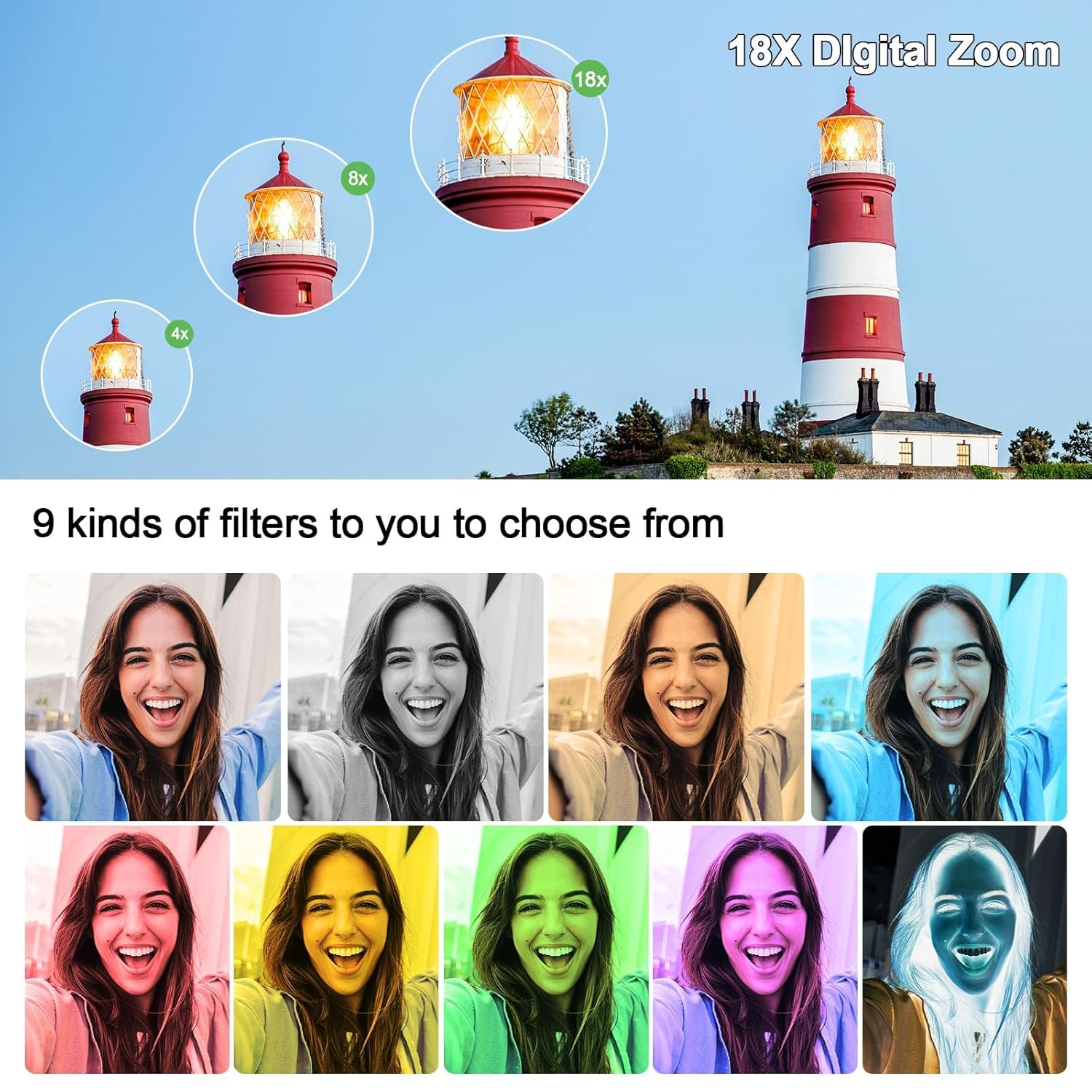 - Compact Camera with Flash & 18X Digital Zoom: The point and shoot digital camera supports flash and fill-light shooting, which allows you to shoot even in low light or dark environments; the 4K camera’s 18x digital zoom function allows you to easily achieve long-range shooting.The compact digital camera 4K is designed for beginners and amateurs, not for professional users
