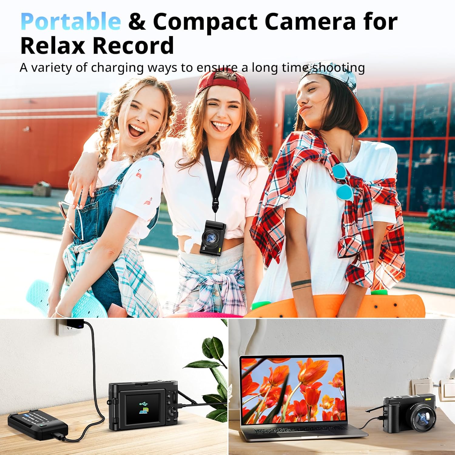 - 【AUTOFOCUS with 180°FLIP SCREEN SELFIE CAMERA 】Say goodbye to blurry shots! Upgraded precise autofocus function that tracks you perfectly, whether you’re moving or posing. Our travel camera has a 3” LCD 180°flip screen lets you see yourself in real time, so you always nail the perfect angle for vlogs, live streams, or Instagram selfies. This compact autofocus camera is easy to use and fully functional allowing you to create high quality content with relax!