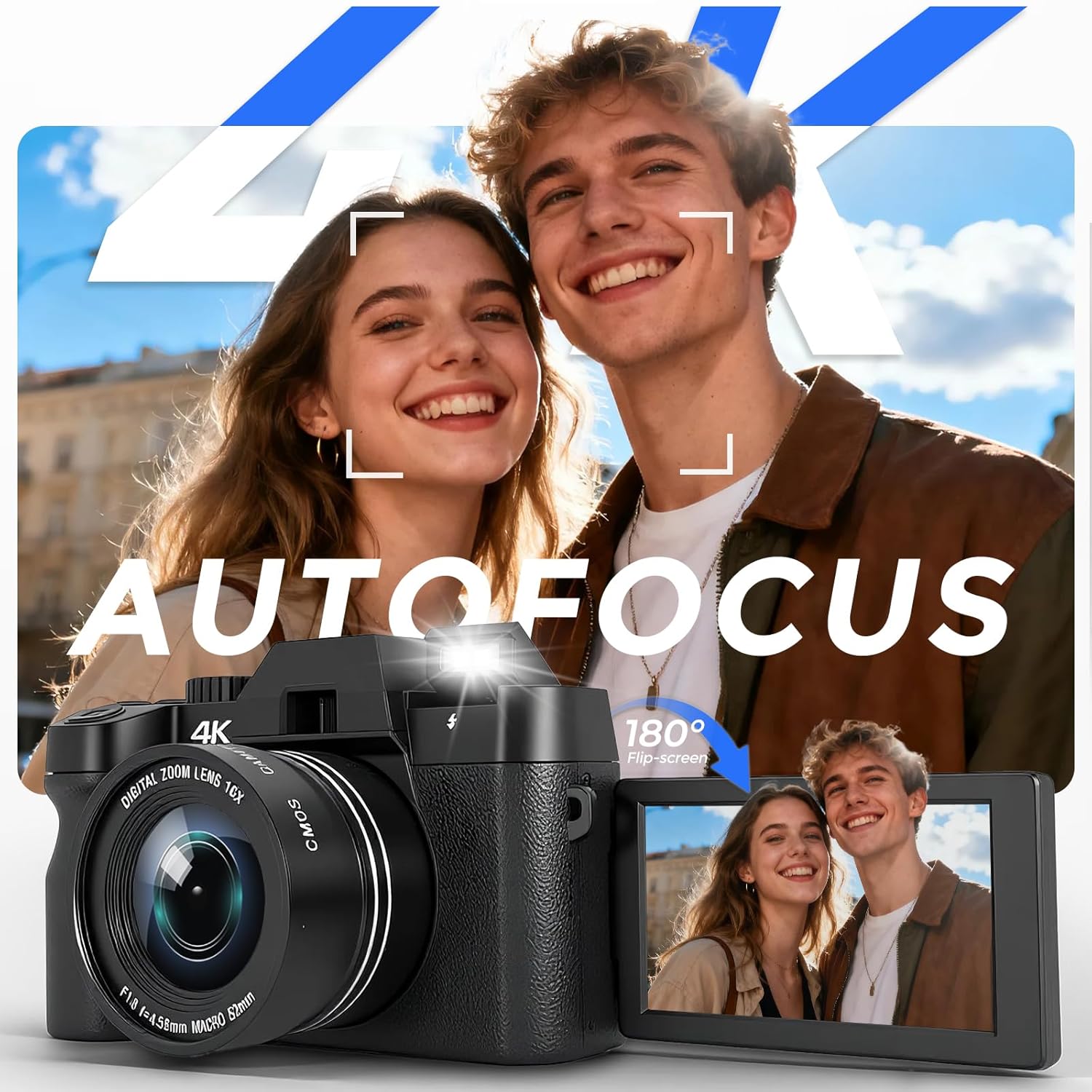 This 4K digital camera is a fantastic value for the price! My girl asked a camera for her and I found this one for her. The image and video quality are crisp and clear, and the auto-focus works quickly and accurately under good lights. I love the flip screen—it makes vlogging and selfies so much easier. The included wide-angle and macro lenses are a great bonus, and having two batteries means I can shoot for hours without worrying about power. Setup was simple, WiFi transfer works well, and the MicroSD card and reader make it ready to use right out of the box. Perfect for my 8 years old to shoot videos or everyday photography!