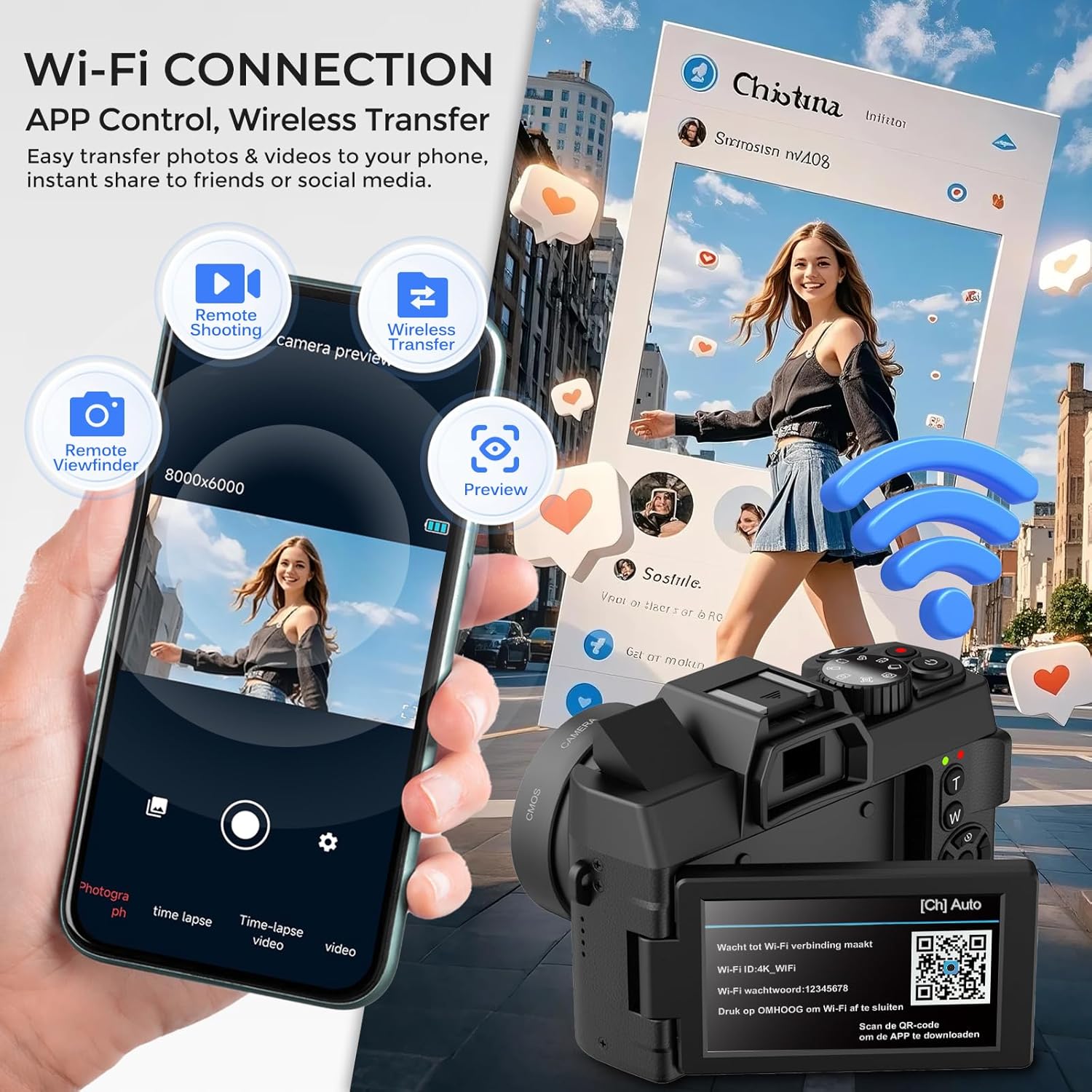 - [ Wireless WiFi Connection ] The vlogging camera newly enhanced WiFi function enabled to wireless connect to your smartphone, you can preview images and videos on your smartphone immediately after shooting and transfer easily, enabling social media sharing no need computer transfers.