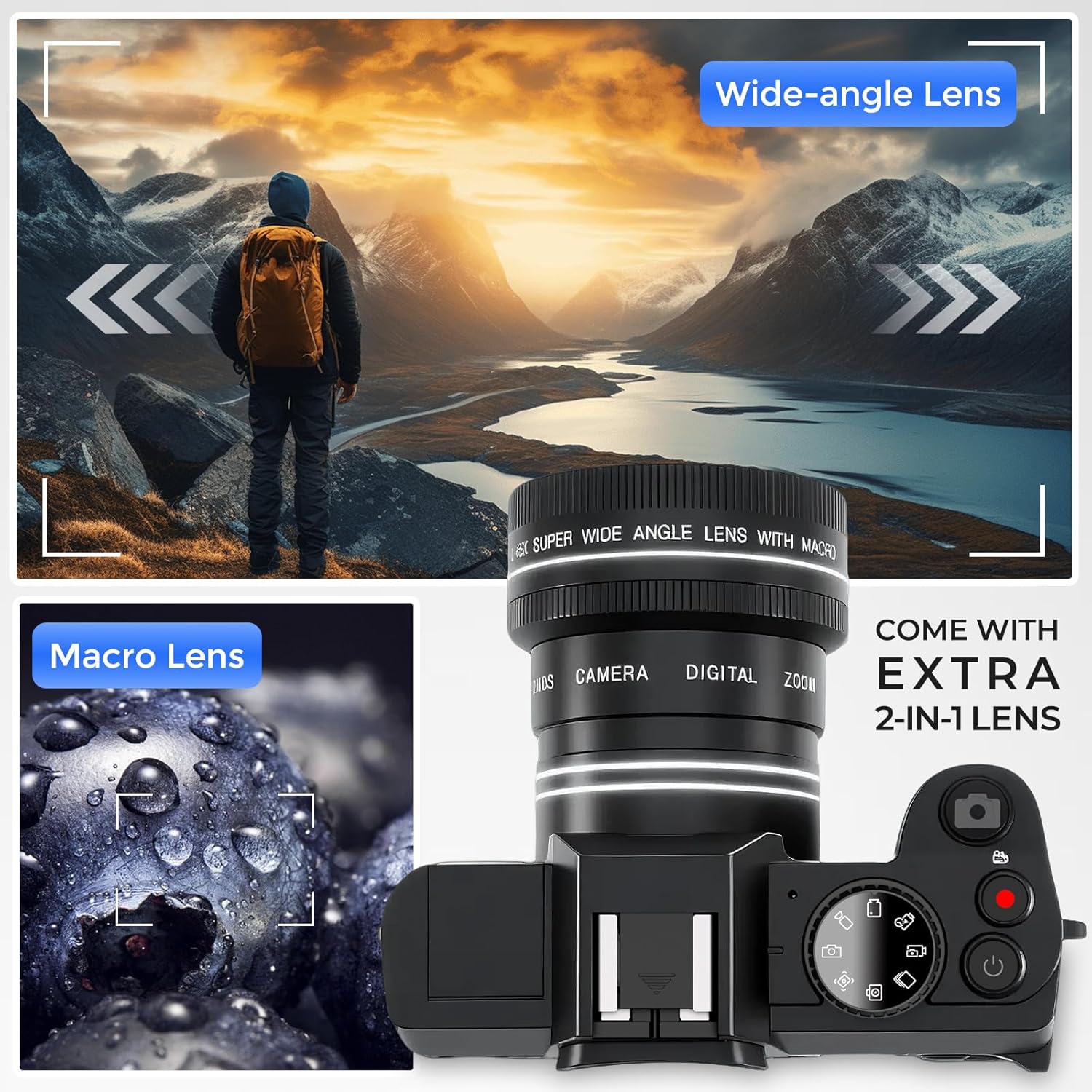 - [ Come with Rich Add-ons ] The compact digital camera comes with rich accessories kit, including wide-angle & macro lens, 2 high endurance 1500mAh batteries, battery charger, 32GB MicroSD card, card reader, strap, USB cable, cleaning cloth. Creators can take great photos and videos with these accessories! It can be an ideal birthday gift or Christmas gift for yourself, for friends, families, teens, kids, and many other content creators beginners.