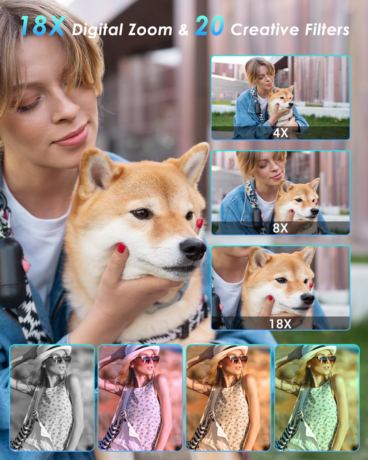 - 18x Zoom, Flash & 20 Creative Filters: Bring distant subjects closer in stunning clarity with the 18x digital zoom. This point and shoot digital camera also lets you unleash your creativity with 20 fun filters and a beauty mode, enhancing your shots instantly—no editing required. Plus, its powerful built-in flash cuts through the darkness, ensuring your photos are bright and clear, day or night