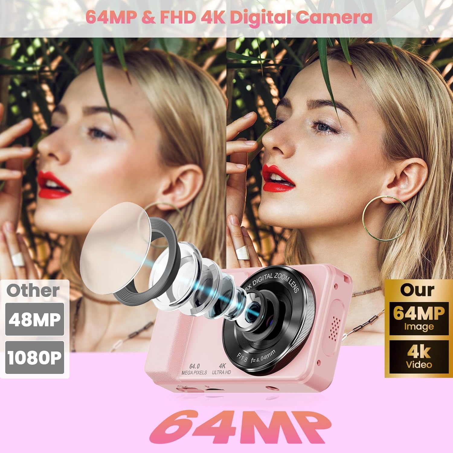 - 【Say Goodbye to Blurry Shots – 64MP & 4K UHD】Tired of grainy photos? Our digital camera features a high-performance CMOS sensor that snaps crystal-clear 64MP images and smooth 4K video. From playful kids to fast-moving pets, fast autofocus locks on instantly—just point, shoot, and enjoy vibrant, vivid memories every time. Perfect for family moments, travel, and parties. ✨ (Pro tip: For best results, shoot in good light around 8 ft away.)