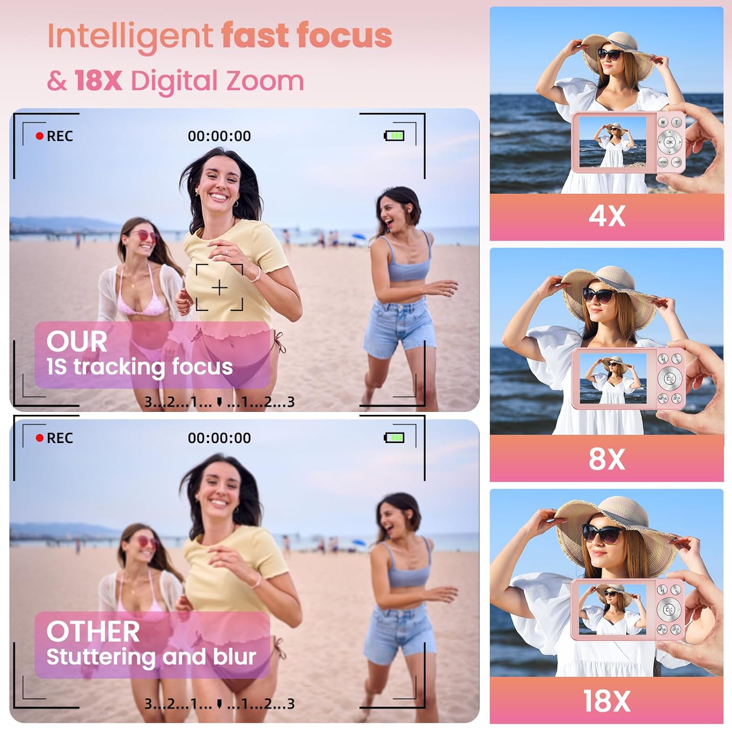 - 【Flawless Shots! 20 Filters & 18x Zoom】Struggling with dull photos or far-off action?? Nail every shot! 20 beauty filters work instantly – enhance skin, brighten colors for natural, stunning looks straight from the camera. No more dark or blurry indoor pics! The built-in flash clears up dark indoor/evening shots. Powerful 18x zoom captures distant details like your pup zooming at the park! One easy-to-use point and shoot camera for all your favorite memories