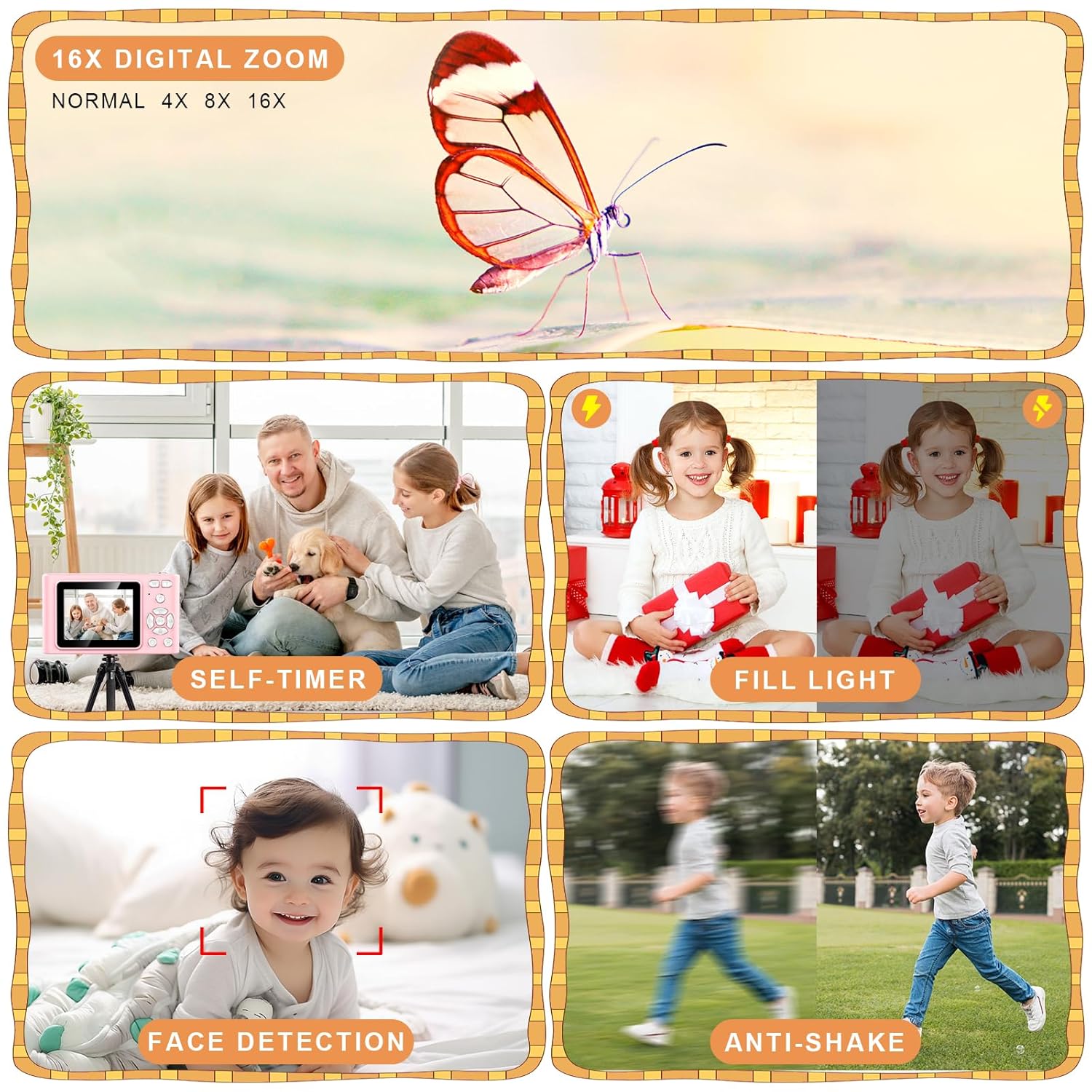 - Multifunctional Kids Camera: This kids camera is designed with ergonomics in mind, featuring easy-to-access buttons and a simple function menu, making it a breeze for children aged 5 to 13 to operate. It supports fill light, anti-shake, continuous shooting, self-timer, slow motion, and face capture. With 12 filter effects, a pause function, and 16X digital zoom, kids can easily zoom in and out to capture distant landscapes