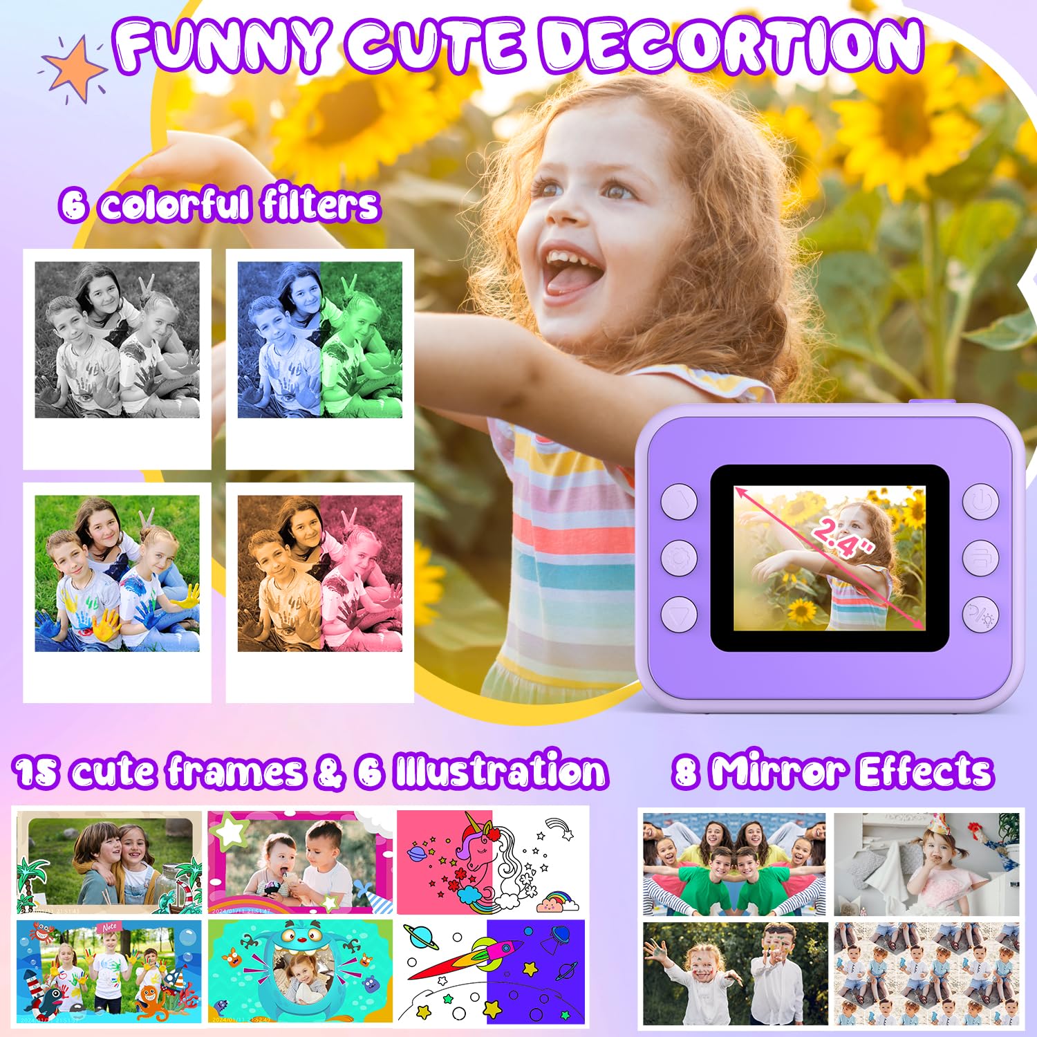 - Multifunctional Kids Instant Print Camera: This kids camera with instant print, 10X digital zoom, 2.4-inch large screen, flashlight, time lapse, brust shooting, 4 puzzle games, MP3, 21 cute frames, 8 Mirror effects and 6 filters, etc. Which can meet the different needs of children. It is a good choice to accompany children to grow up happily. Bring a wonderful moment to you and your family