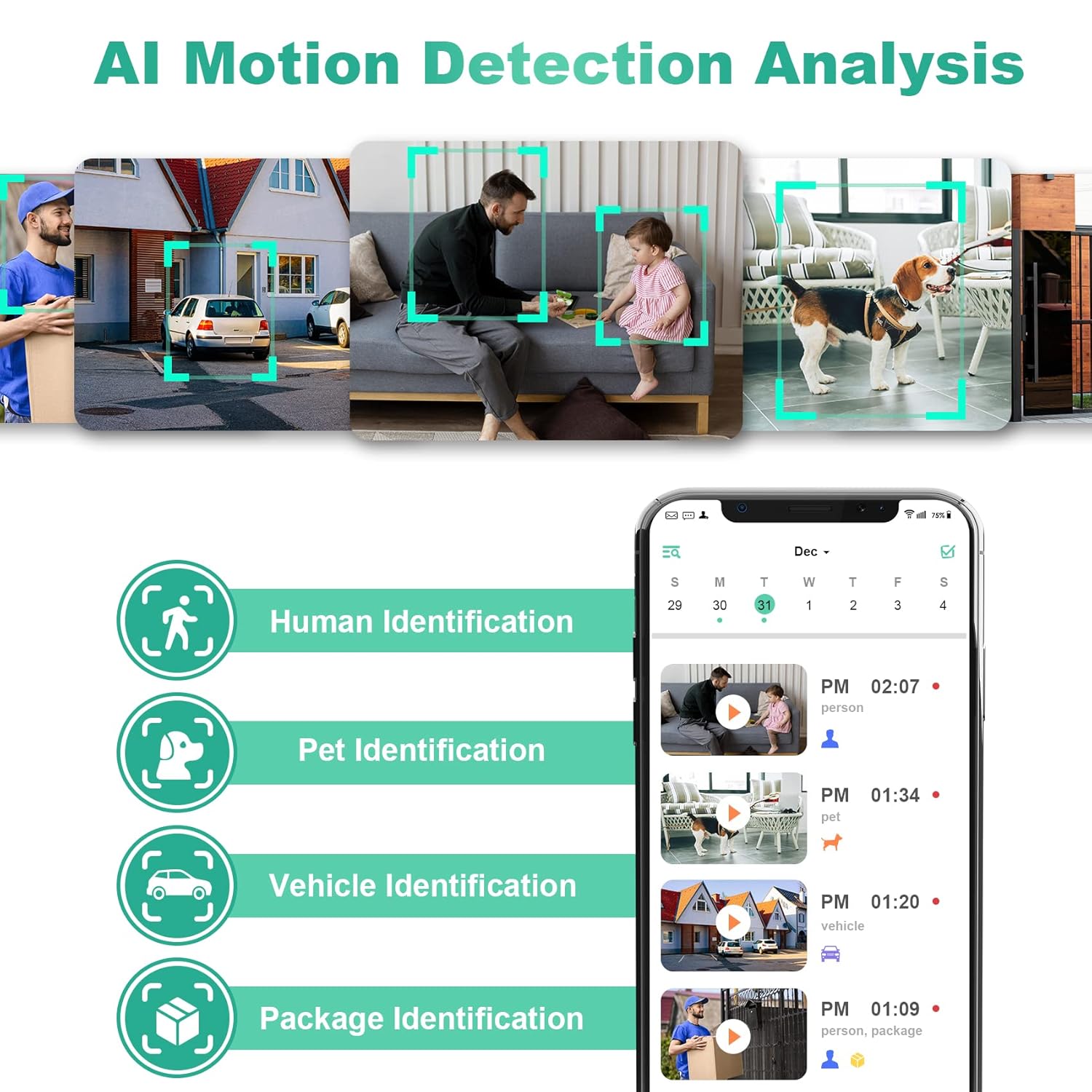- PIR Motion Detection with AI Analysis Recognition: This outdoor camera wireless with advanced smart AI motions detection, it can clear analysis and recognition person, vehicle, pet and package. The AI PIR sensor will be triggered in real time once the outdoor security cameras detect motion, at the same time, the notification will be pushed to your phone via the app. And this security camera can be shared with multiple users.