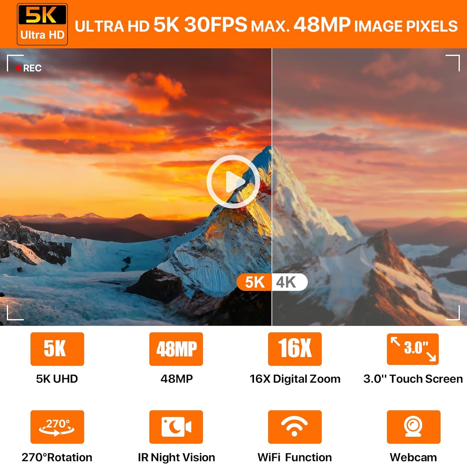 - 【5K UHD VIDEO & 48MP PHOTO CAMEAR】This Video Camera records videos up to 5K resolution at 30FPS and high-resolution 48MP photos with this camcorder.The 5K video camera records videos in 2.7K, 4K, 5K HD resolution, ensuring smooth and stable video recording. The 3-inch IPS touch screen ,16X digital zoomand 270 degrees rotatable youtube camera allows you to capture and watch with precision.The high performance is suitable for family daily shooting and video production enthusiasts