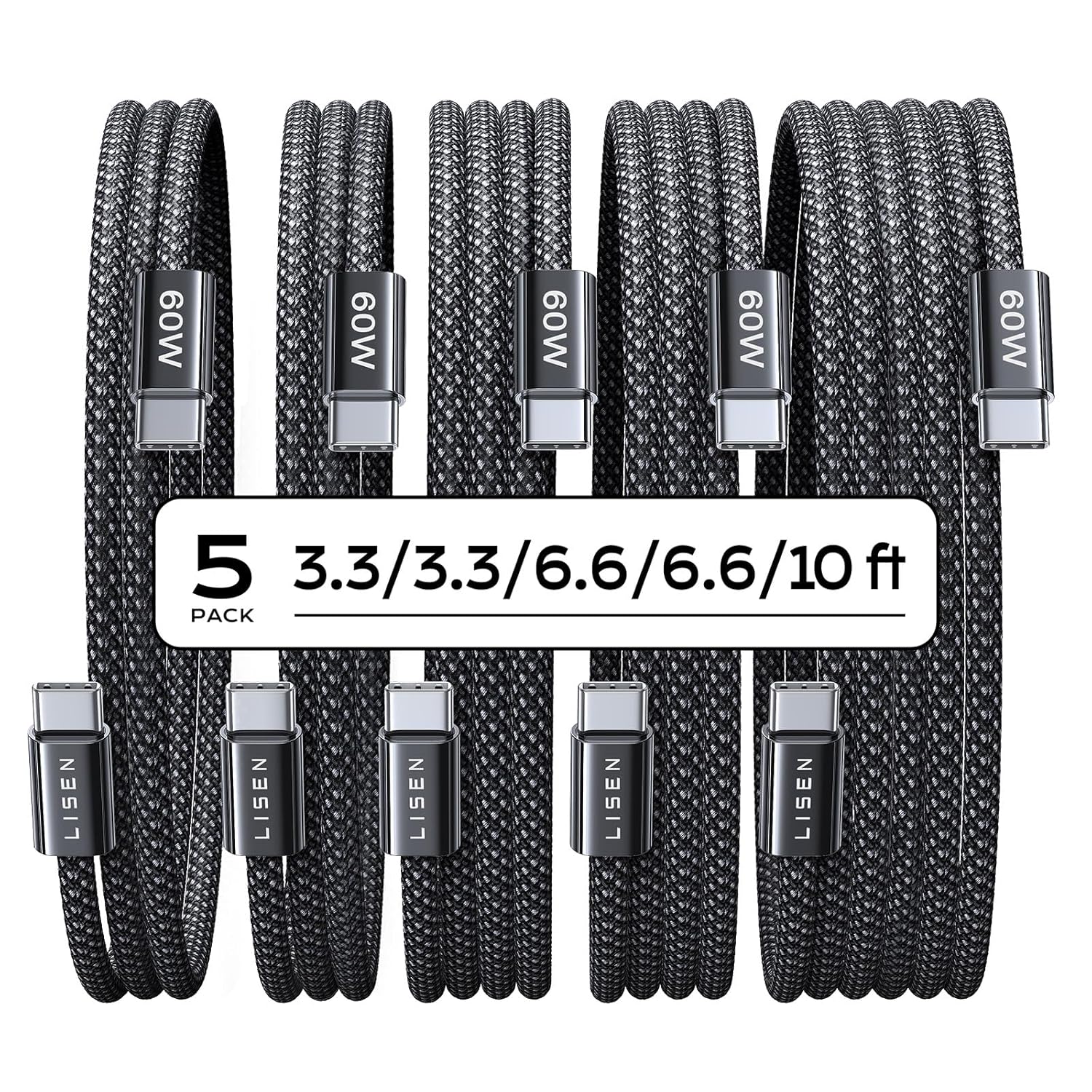 LISEN USB C Cable, 5-Pack [3.3/3.3/6.6/6.6/10FT] for iPhone 17 Charger Cord, 60W USB C to USB C Fast Charging Cable for iPhone 17 Air 16 15 Pro Max, Samsung Z Flip 7/S25/S24,… by LISEN