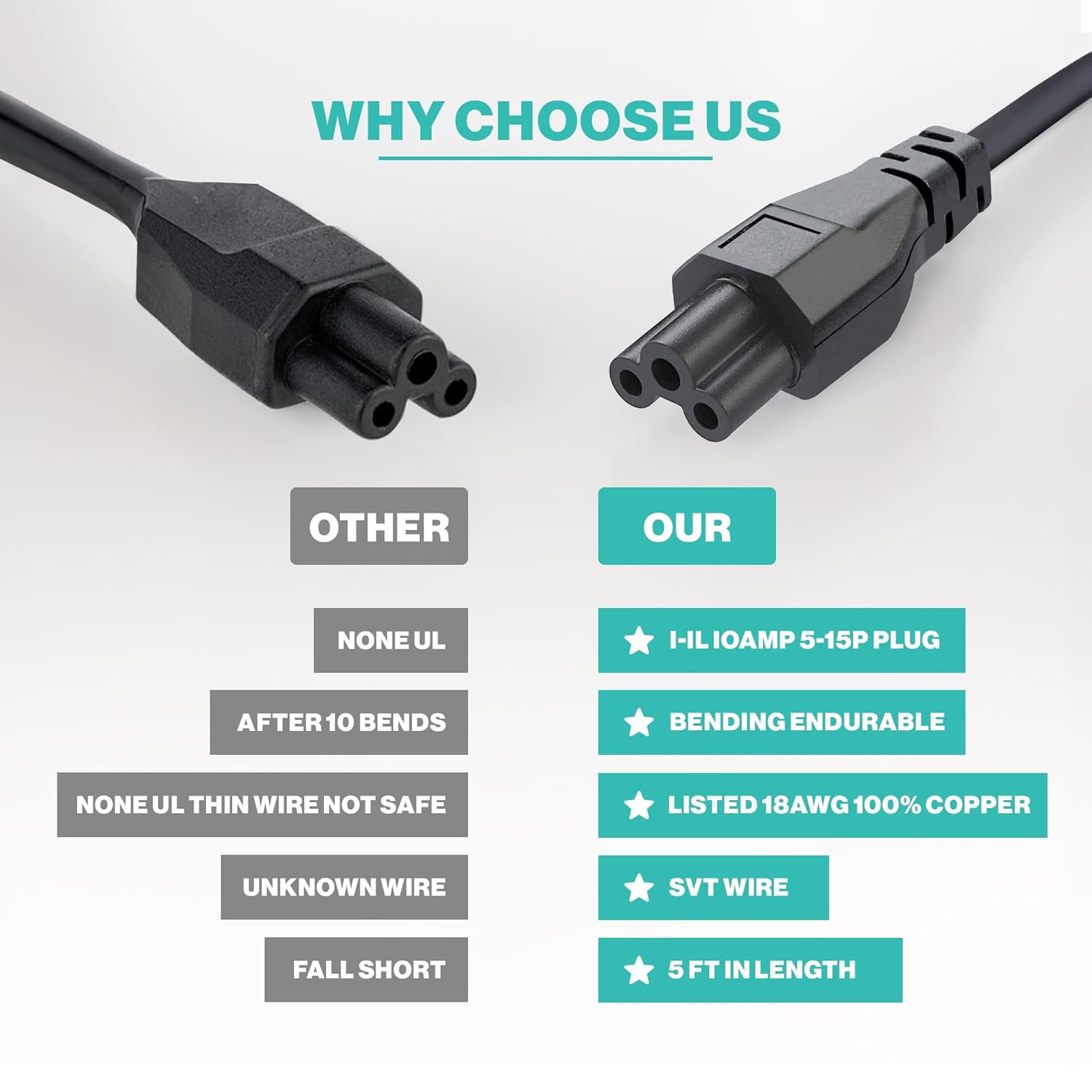- UNIVERSAL COMPATIBILITY: 3 Prong power cord IEC C5 connector works with most power bricks for laptops/notebooks, monitors, scanners, printers, and more | Replacement laptop charger head power supply cable/cord.