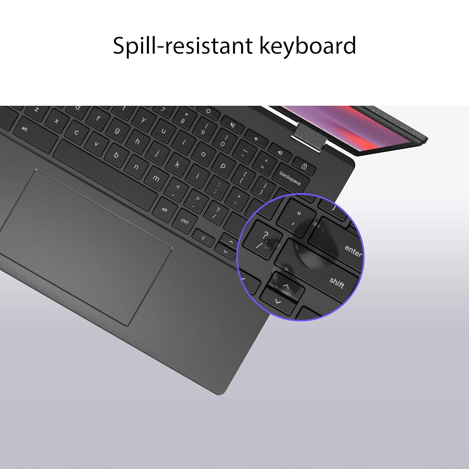 - ASUS Antimicrobial Guard to inhibit bacterial growth by up to 99% over a 24-hour period to keep your Chromebook hygienic