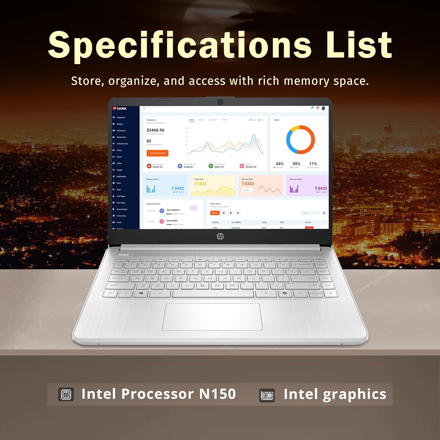 - ใEfficient Quad-Core PerformanceใHP Laptop powered by an Intel Celeron N150 (4-Core, up to 3.6GHz Turbo Boost), this laptop delivers smooth multitasking for everyday use. Effortlessly handle 20+ browser tabs, HD streaming, and Office applications without slowdowns. Intel UHD Graphics ensures crisp, clear visuals for all your tasks.