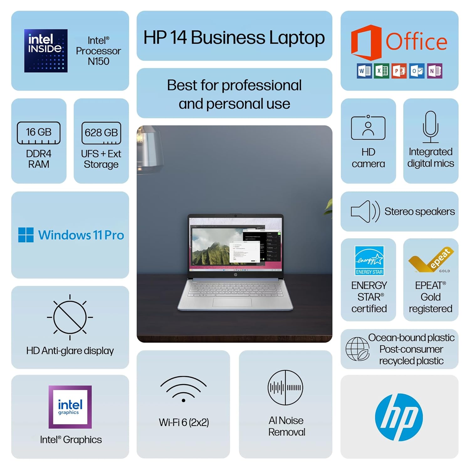 Specification: HP 14″ Laptop 2025 Business Student Slim Computer, Lifetime MS Office, Copilot AI, Quad-Core Intel CPU, 16GB RAM, 628GB Storage (128GB UFS+500GB Ext), MarxsolAccessory, Wi-Fi 6,… by HP