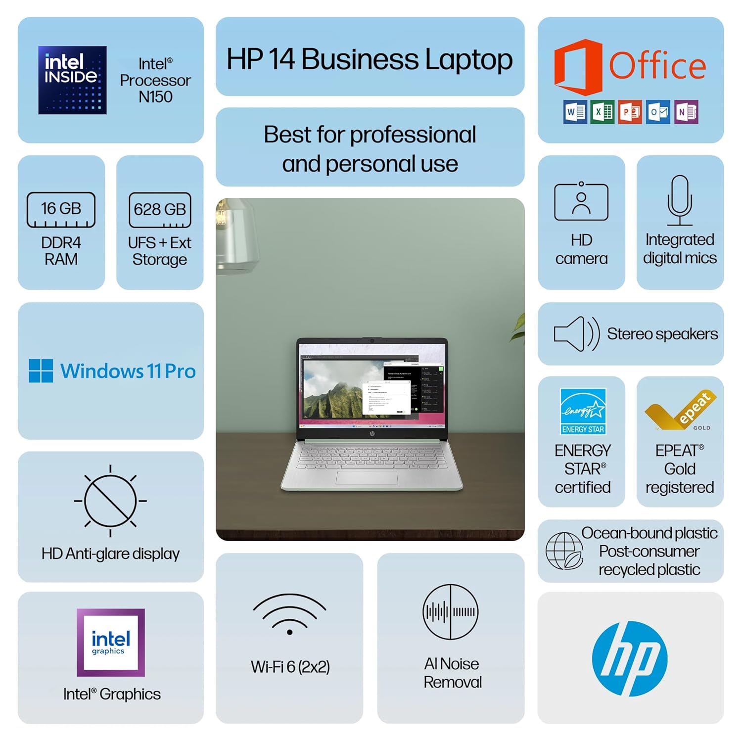 Specification: HP 14″ Laptop 2025 Business Student Slim Computer, Lifetime MS Office, Copilot AI, Quad-Core Intel CPU, 16GB RAM, 628GB Storage (128GB UFS+500GB Ext), MarxsolAccessory, Wi-Fi 6,… by HP