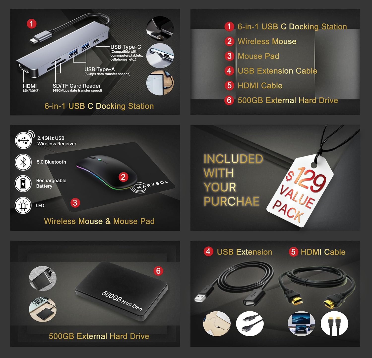 - 【Authorized MarxsolAccessory with Lifetime Office 2024】Bundle includes 6-in-1 USB-C Docking Station Hub (with USB 3.0, 4K-HDMI, USB-C Connection, SD/TF Card Reader), 500GB external drive, USB extension cord, HDMI cable, mouse pad, and wireless mouse. Free Lifetime Microsoft Office 2024 installed. For Home, Student, Professionals, Small Business, School Education, and Commercial Enterprise.