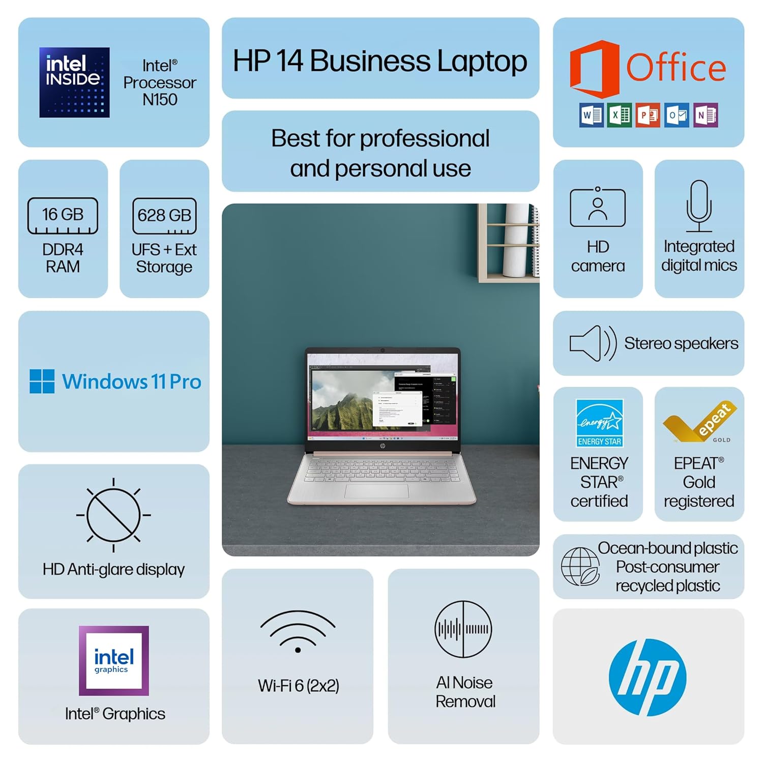 Specification: HP 14″ Laptop 2025 Business Student Slim Computer, Lifetime MS Office, Copilot AI, Quad-Core Intel CPU, 16GB RAM, 628GB Storage (128GB UFS+500GB Ext), MarxsolAccessory, Wi-Fi 6,… by HP