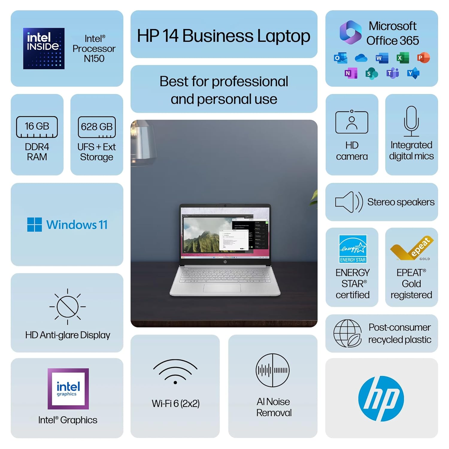 About HP 14 Laptop Student Business 2025 Flagship Computer, AI Copilot, 4-Core 13th Gen Intel CPU, 16GB RAM 628GB Storage (128GB UFS+500GB Ext), 1-Yr Office 365, Long Battery…